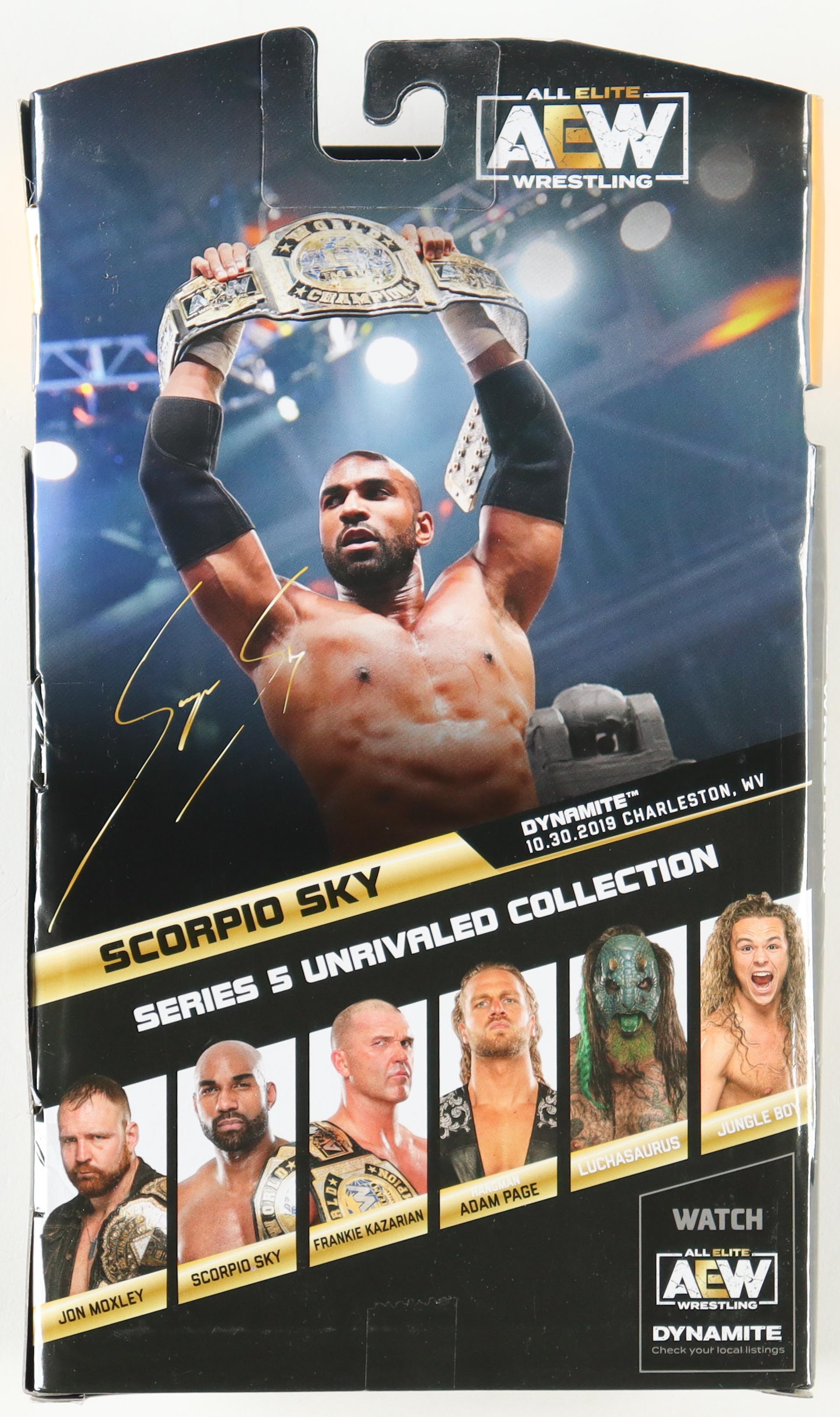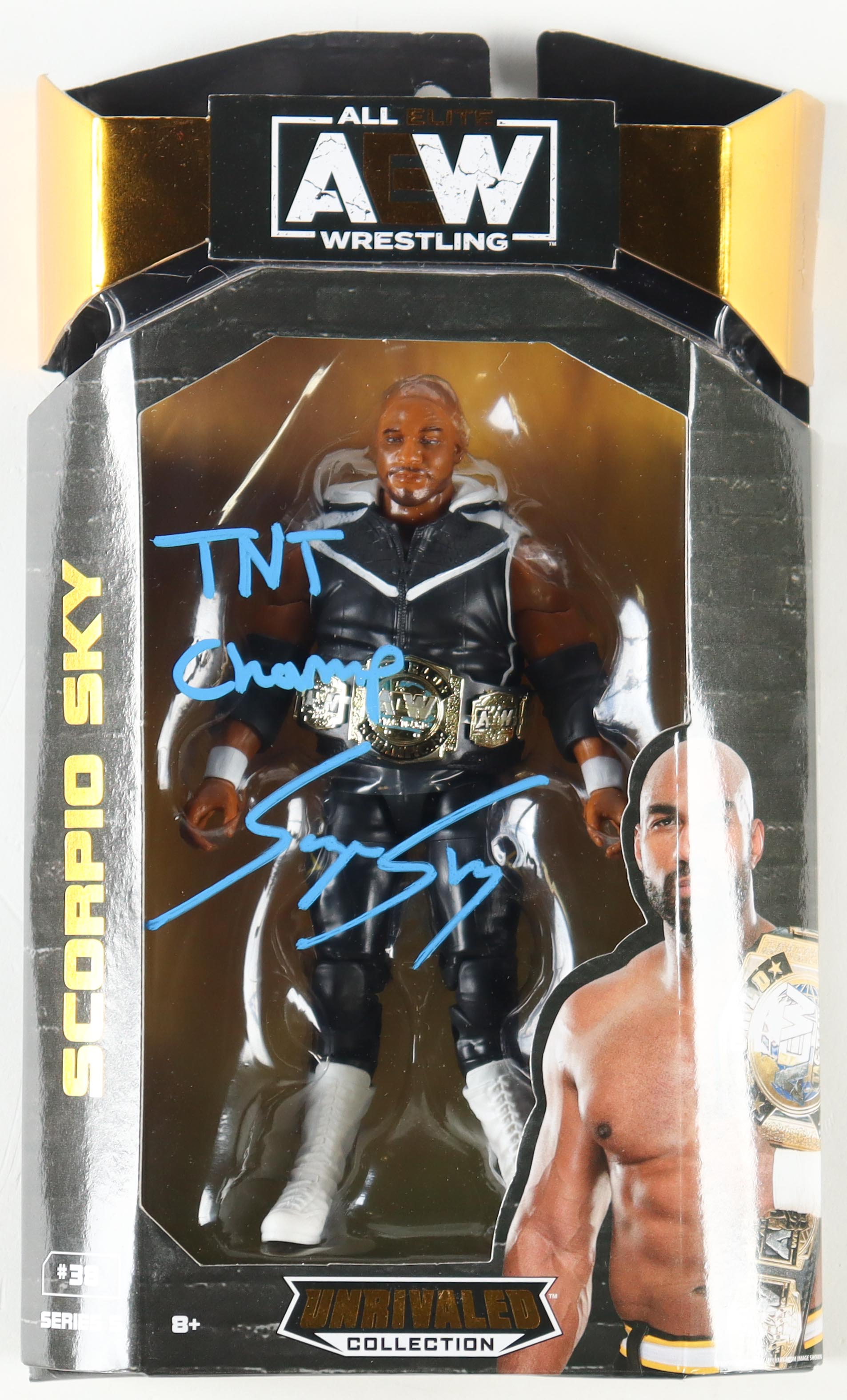 AEW action figure measures approximately 7" in height. Hand-signed and inscribed on the original packaging by Scorpio Sky. Please note, there is some creasing and edge wear on the original packaging.