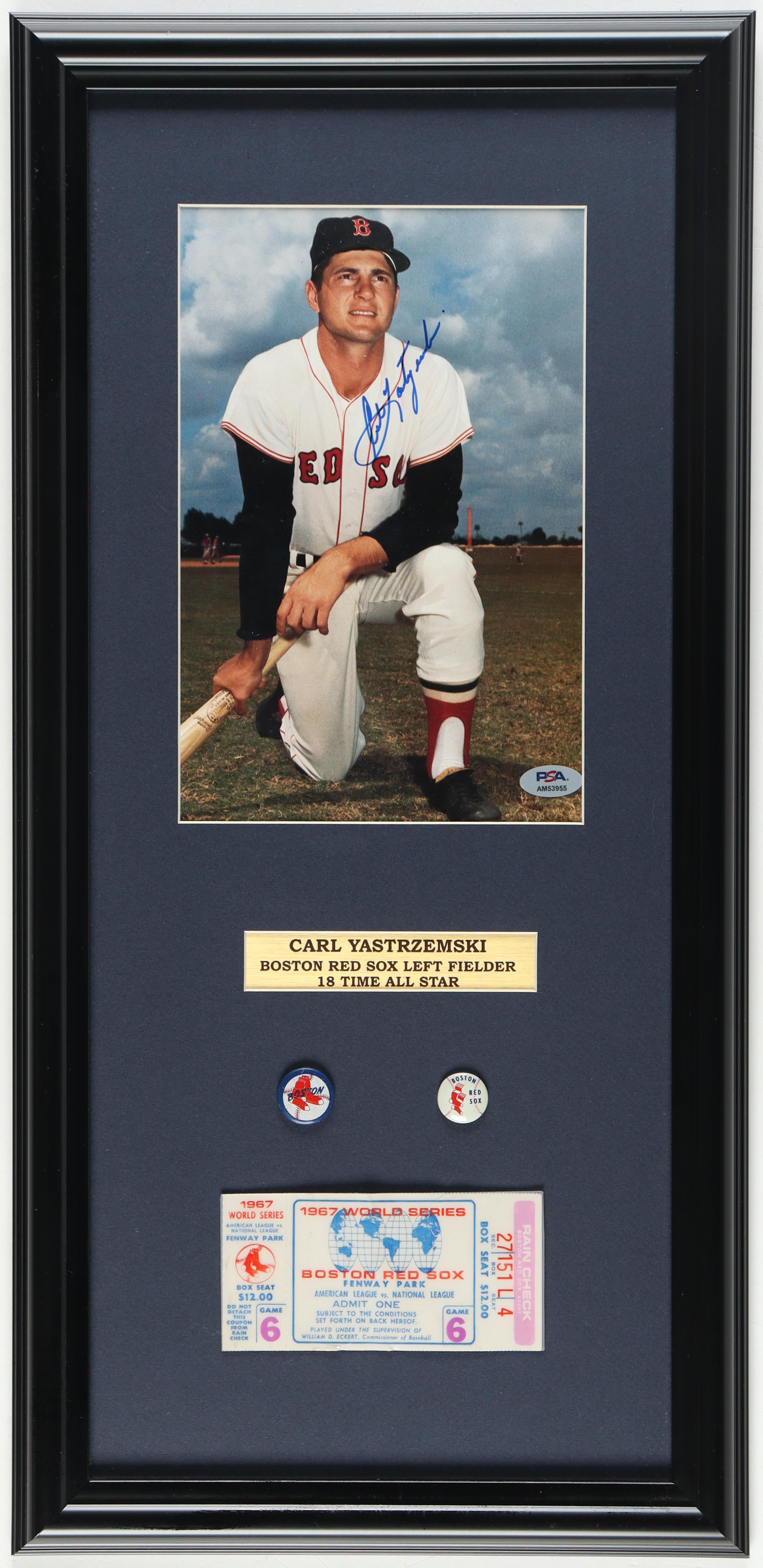 Carl Yastrzemski Signed Red Sox Custom Framed Photo Display With 1967 World Series Ticket & (2) 1960's Red Sox Lapel Pins (PSA)