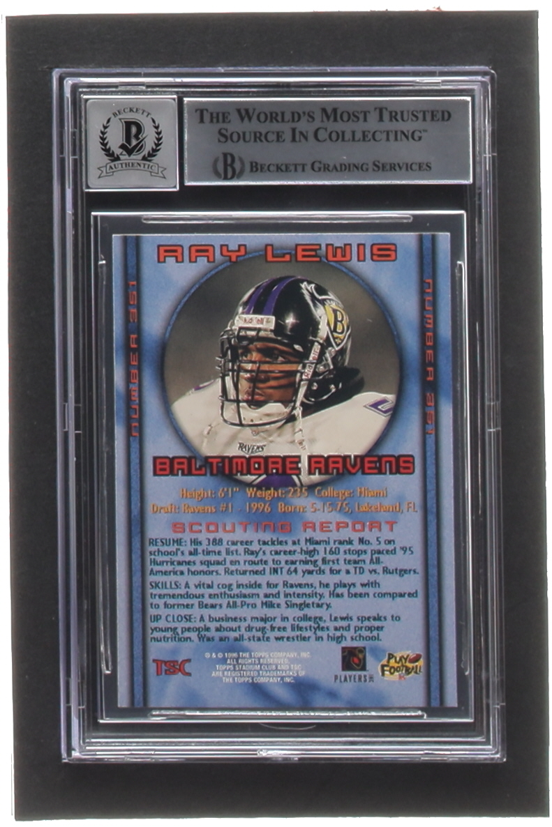 Card has been hand-signed and inscribed by Ray Lewis (Baltimore Ravens, HOF). Autograph has been graded Beckett (BGS) 10. Please see photos for more details regarding the card.