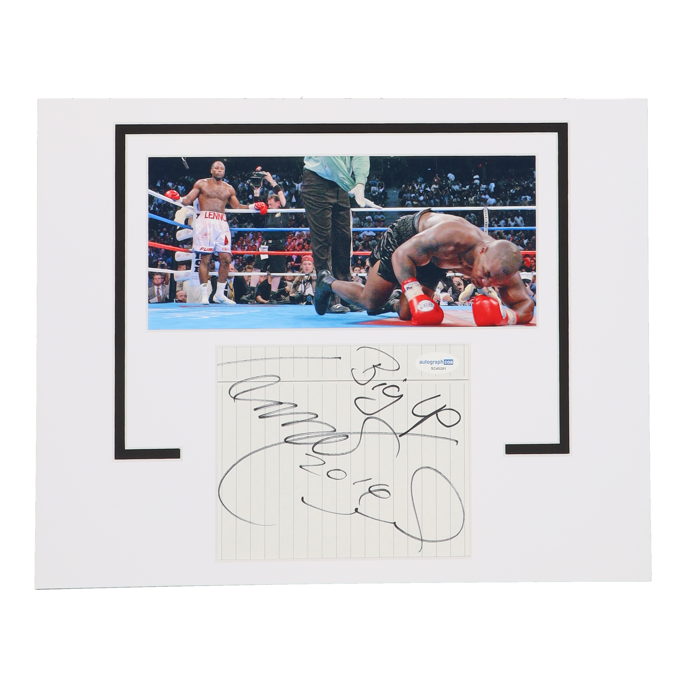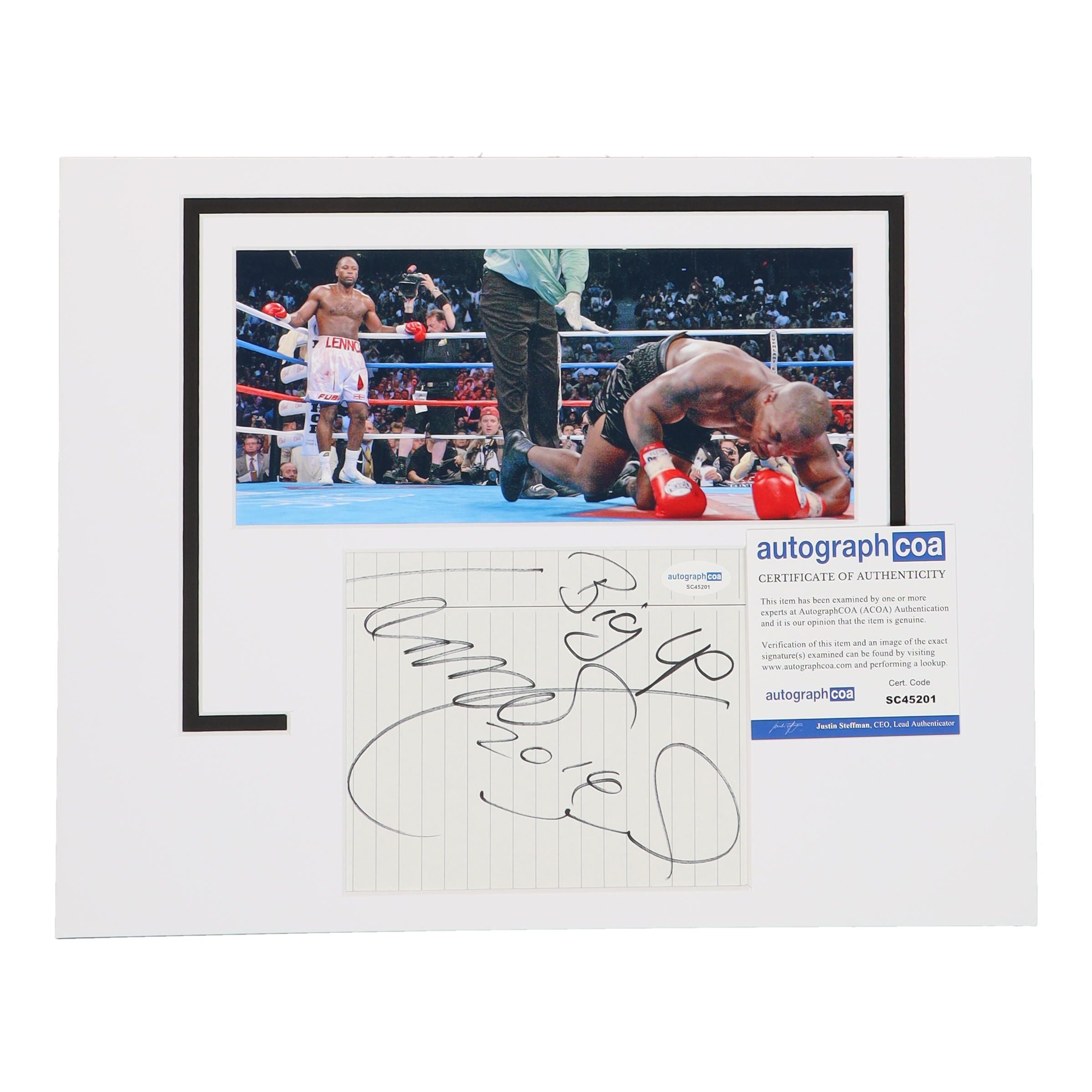 Custom matting measures 11" x 14" in size. Features a cut that has been hand-signed and inscribed by Lenox Lewis.