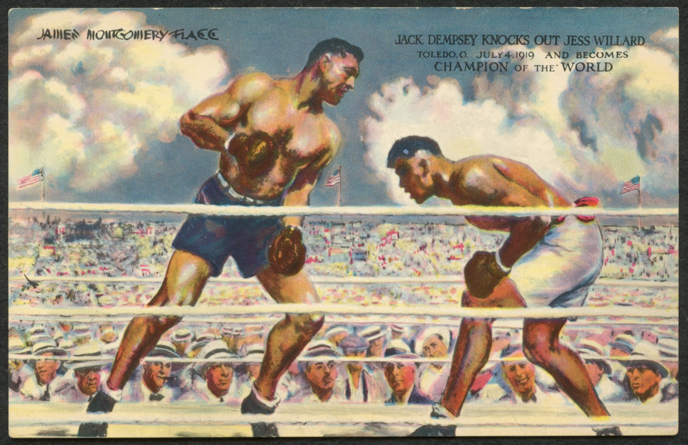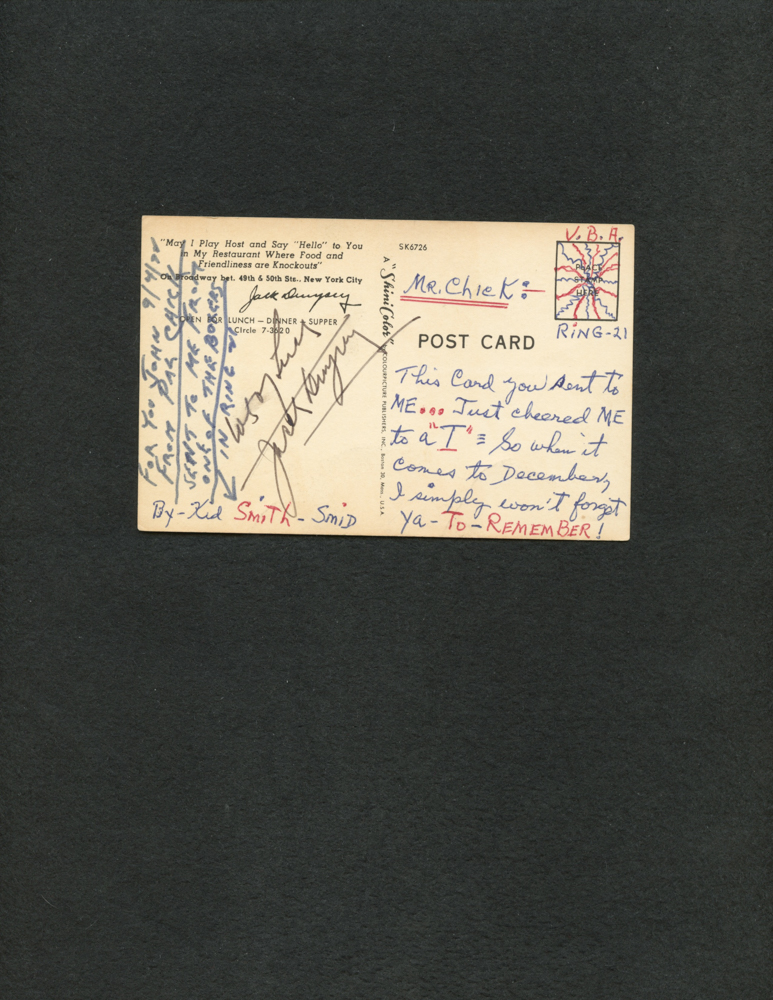 Postcard has been hand-signed in black felt-tip pen by Jack Dempsey (D. 1983).Please note, a note has been penned on the back by an unknown hand. See photos for more details regarding the condition of the postcard.