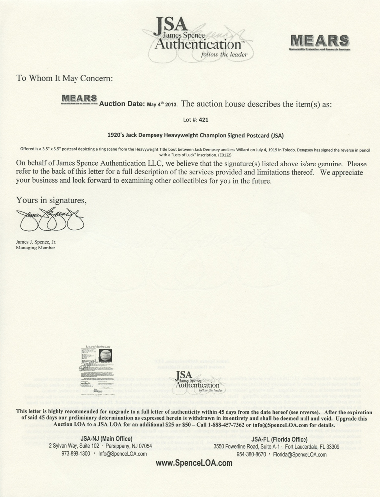 Jack Dempsey Signed Heavyweight Champion Postcard (JSA COA)
