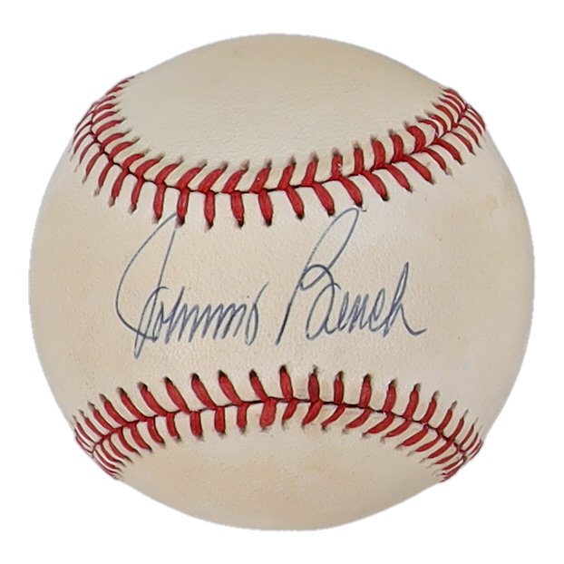 Rawlings Official National League baseball. Hand-signed by Johnny Bench (Cincinnati Reds, HOF). Please note, the baseball is naturally toned.