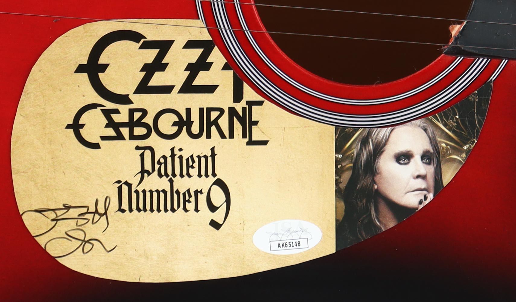 Acoustic guitar measures approximately 38" in length and has been hand-signed on a CD cover that has been repurposed as a pick-guard by Ozzy Osbourne (HOF).