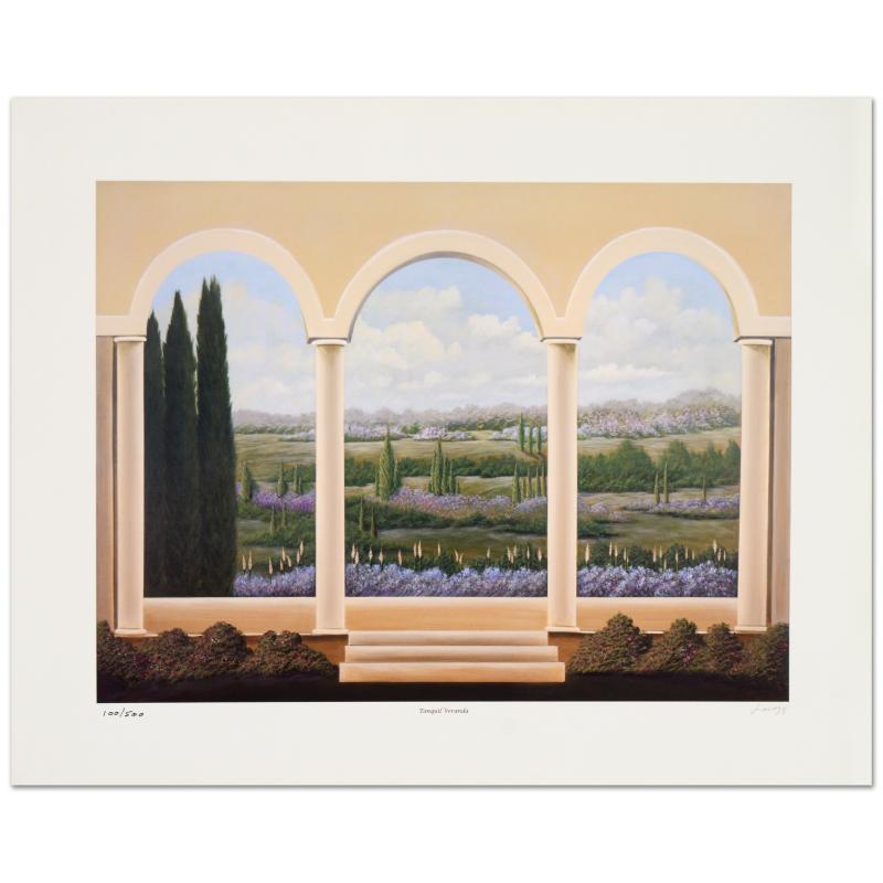 "Tanquil Veranda" is a limited edition lithograph on paper by Steven Lavaggi, hand signed and numbered by the artist! Measures approx. 20" x 16" (with border); 16" x 12" (image).