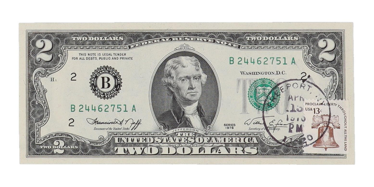 1976 U.S. $2 Two Dollars First Day Issue Uncirculated Legal Tender Note With 13 Cent Stamp & April 13, 1976 postmark authenticating its first day of issue.