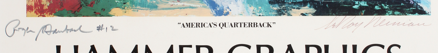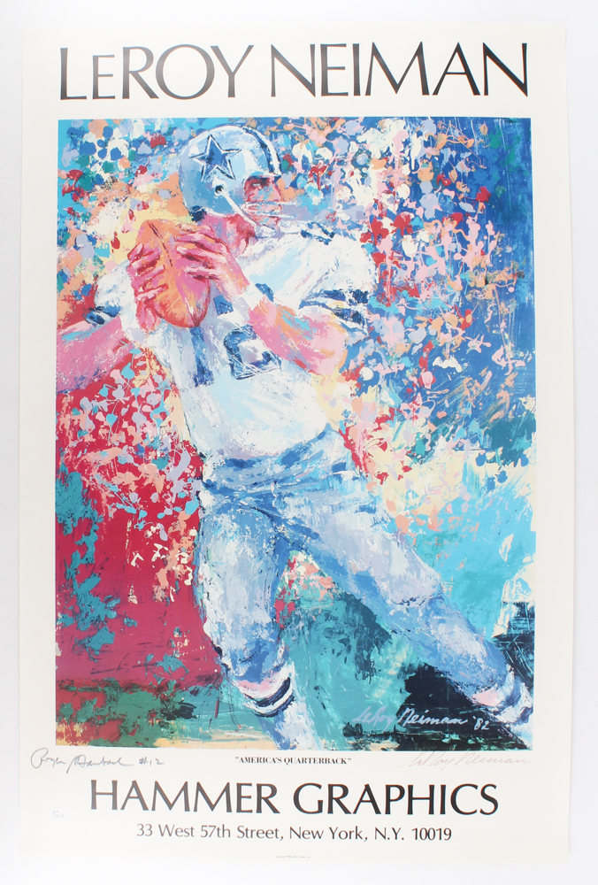 Print measures 22" x 34" in size. Print features "America's Quarterback" hand-signed in black felt tip pen by Roger Staubach (Cowboys, HOF) and LeRoy Neiman (D. 2012).