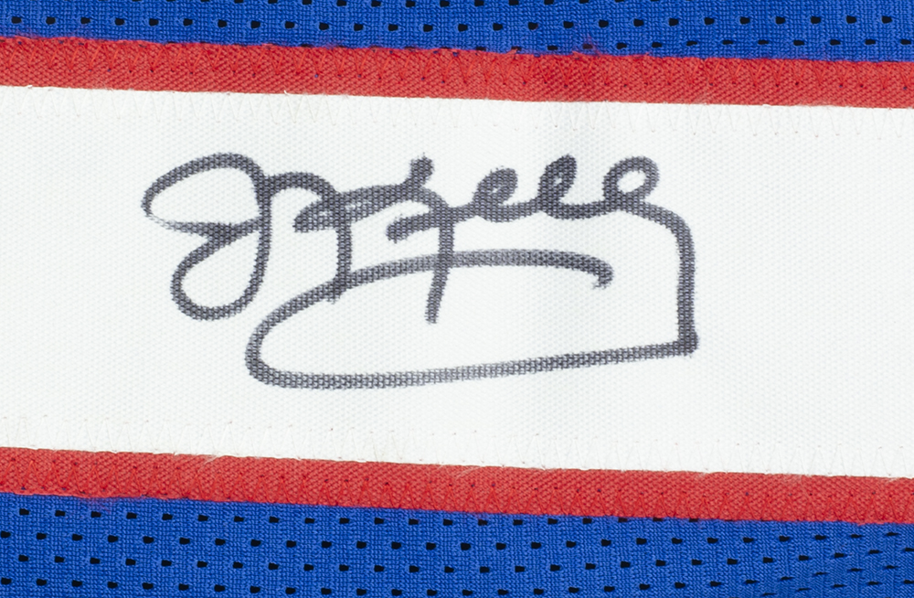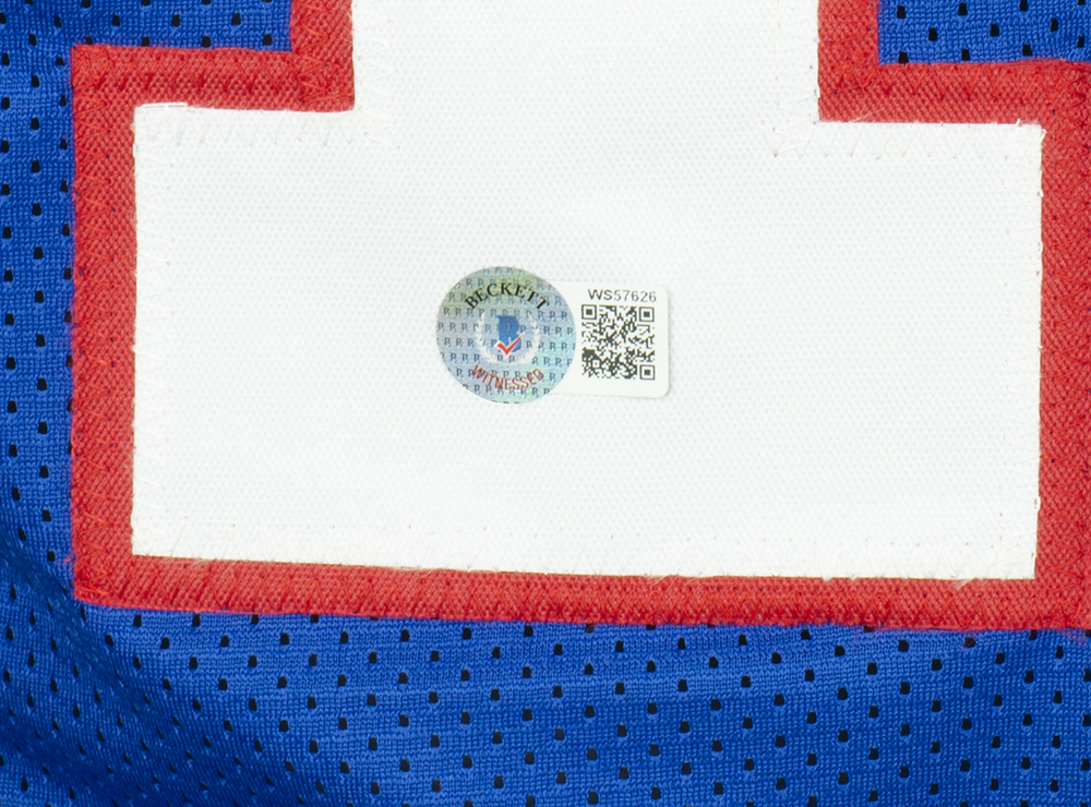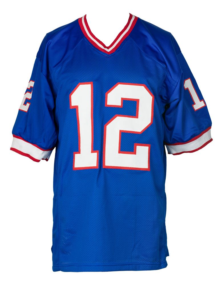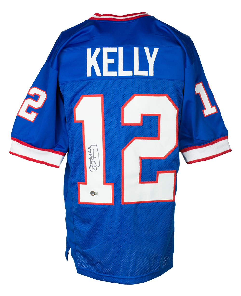 Custom jersey with everything sewn on, size XL. Hand-signed by Jim Kelly (HOF).