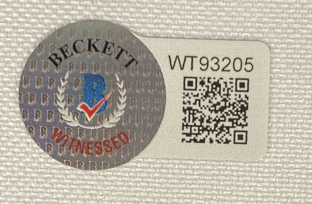 The autograph includes an official Beckett Authentication Services serially-numbered hologram and matching COA for authenticity purposes. The signing of this item was witnessed by Beckett.