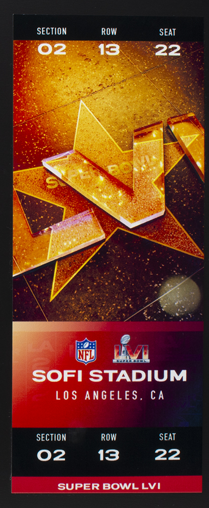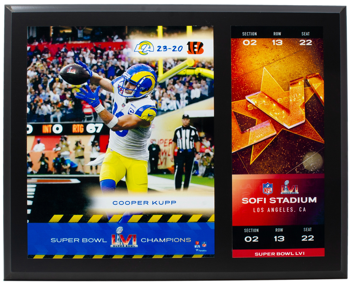 Custom plaque measures 12" x 15" in size and features a photo of Cooper Kupp (Los Angeles Rams) and a replica Super Bowl LVI ticket. Please note, the item is not signed.