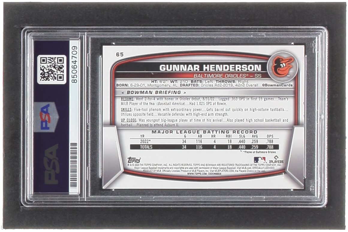 Gunnar Henderson Signed 2023 Bowman #65 RC (PSA)