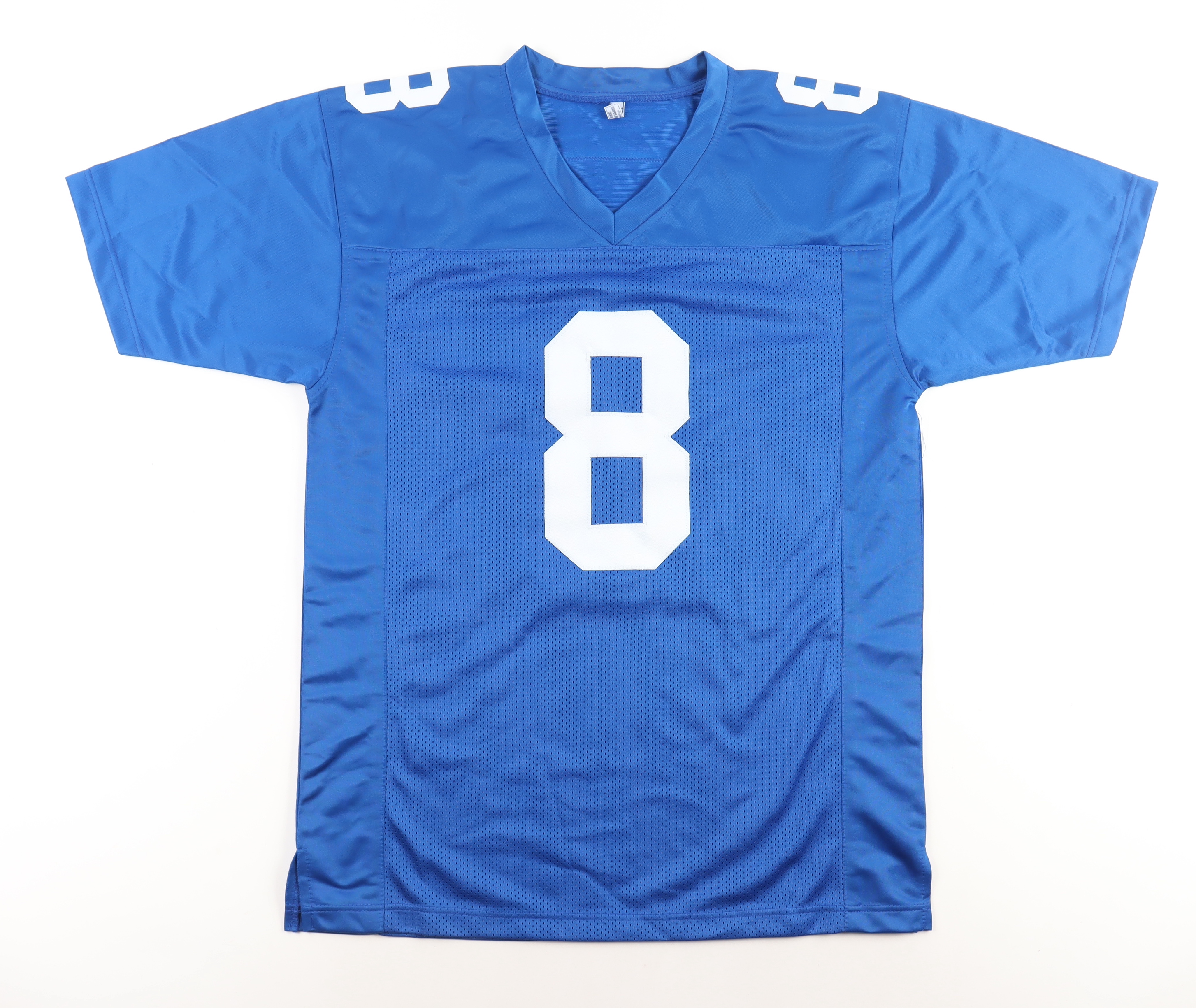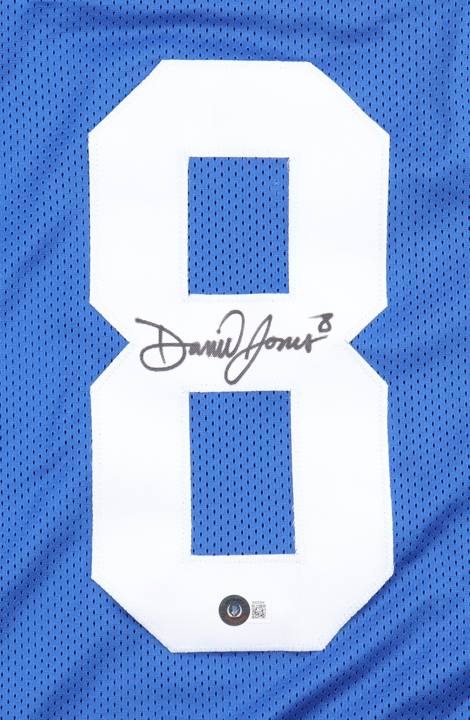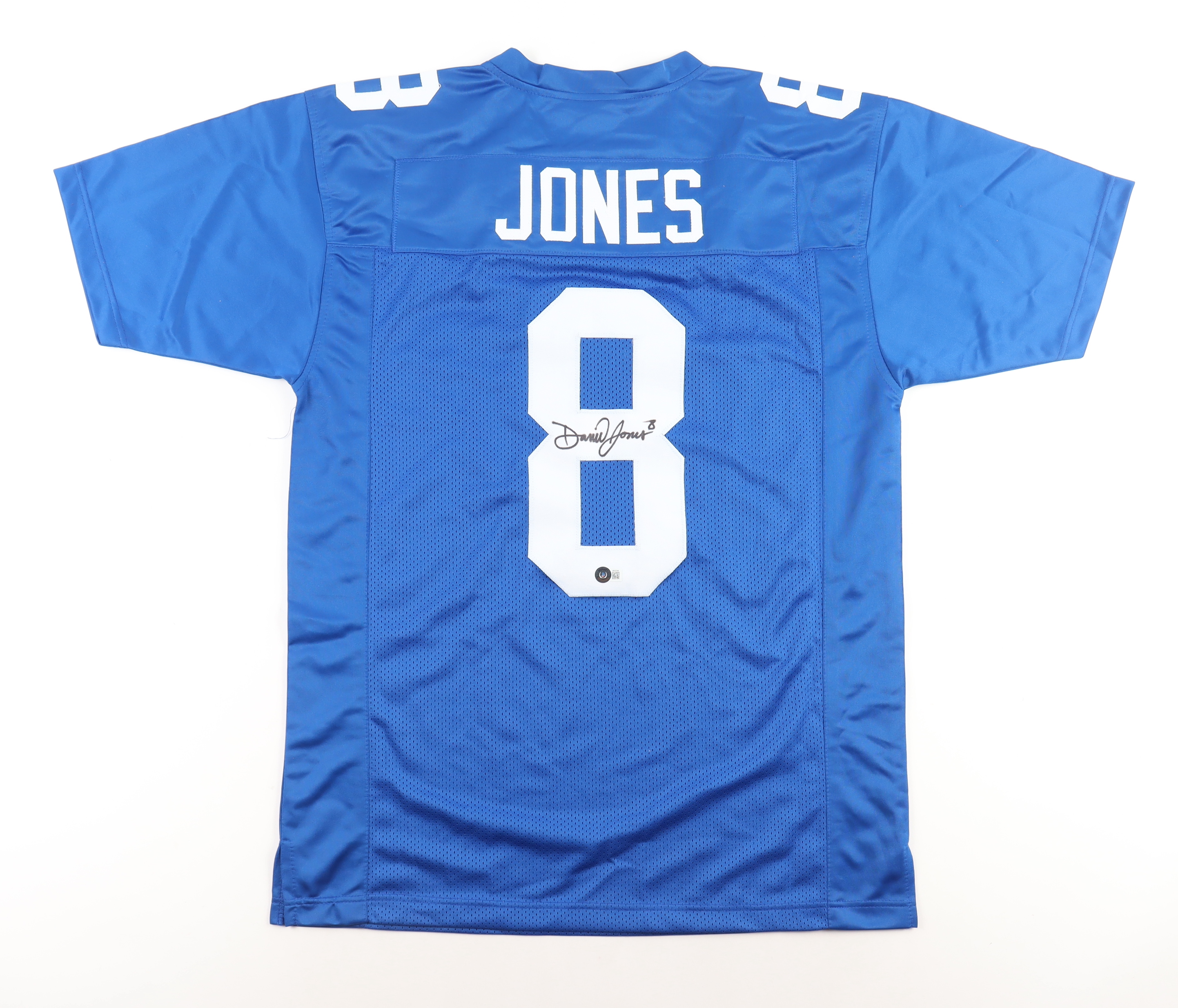 Custom jersey with everything sewn on, size XL. Hand-signed by Daniel Jones.