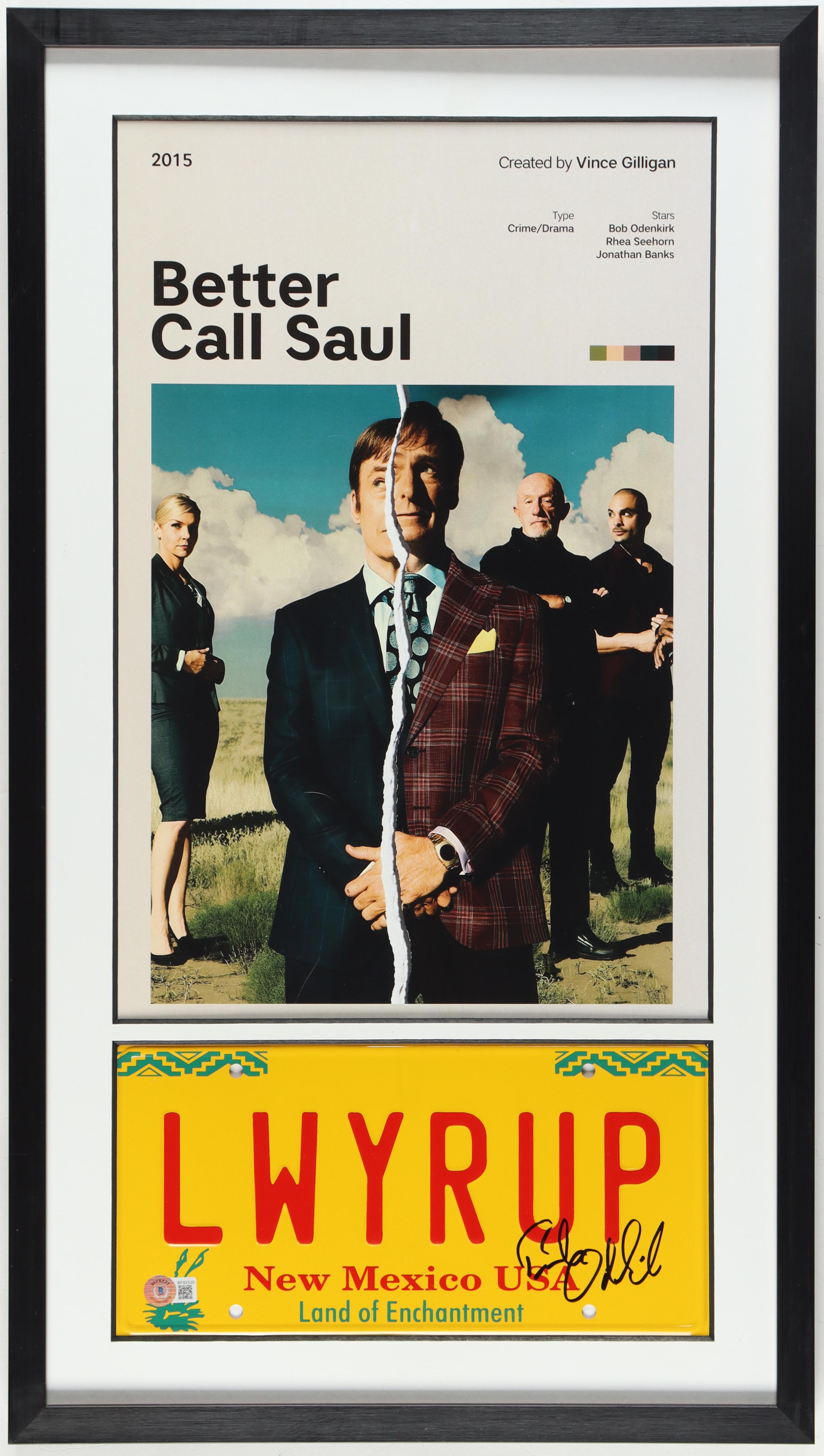 Custom framed display measures 16"x28" and features a photo and replica license plate measures approximately 6" x 12" in size and has been hand-signed by Bob Odenkirk.