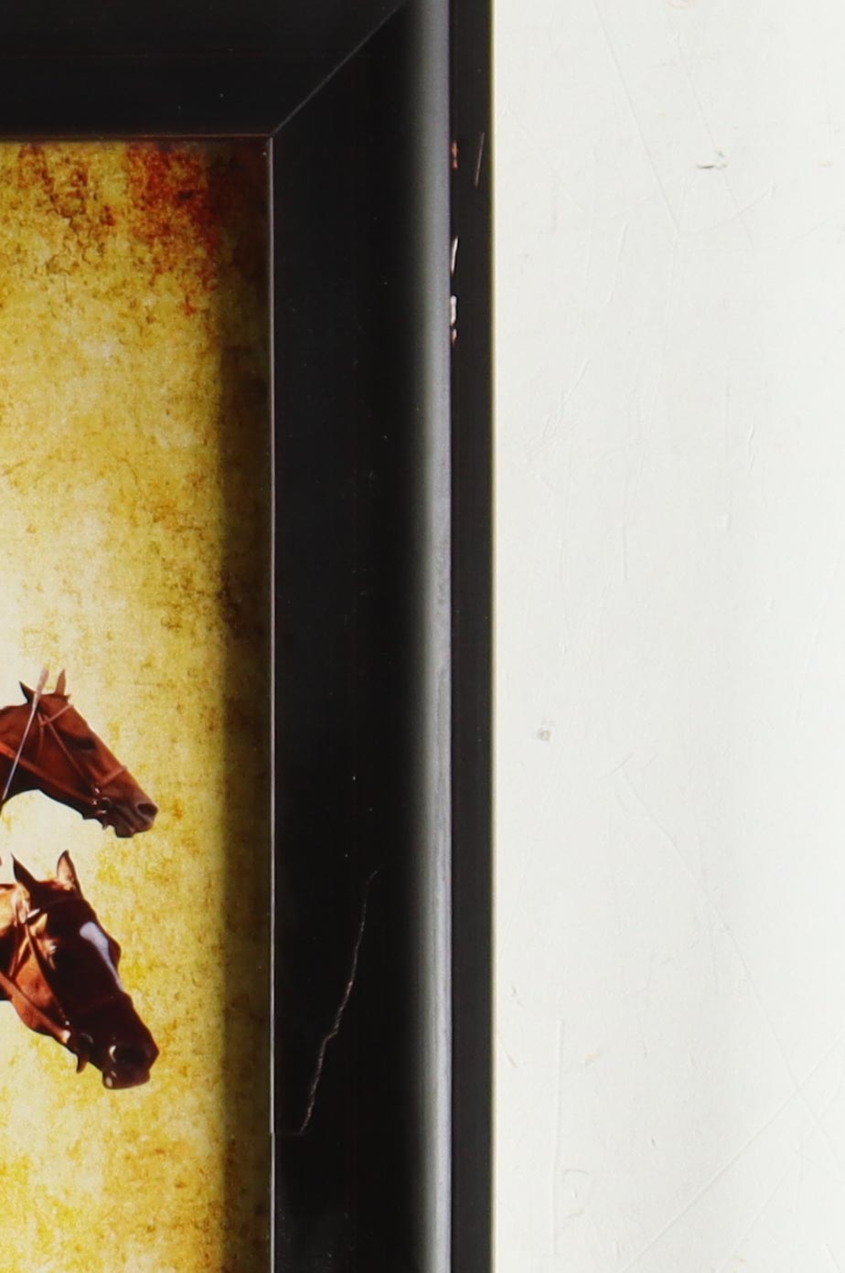 Custom frame measures 19"x23" and features a photo that has been hand-signed by Ron Turcotte (HOF), Steve Cauthen, and Jean Cruguet. Please note there is damage to the framing.