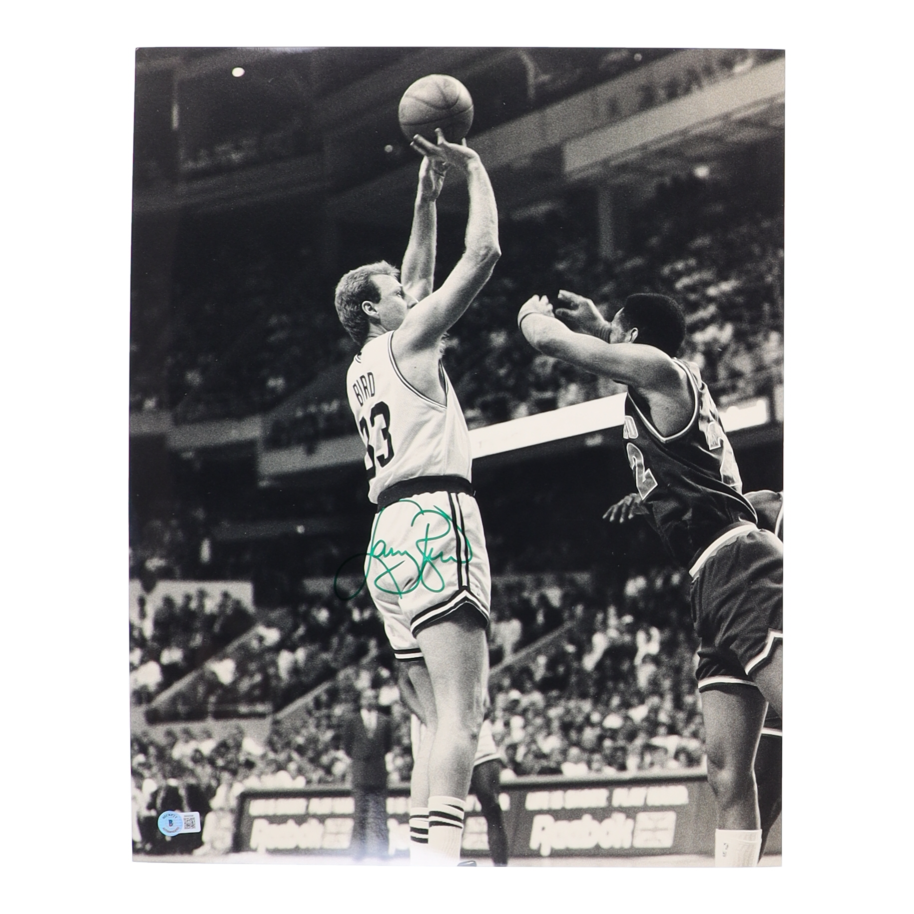 Photo measures 16" x 20" in size and has been hand-signed by Larry Bird (Boston Celtics, HOF).
