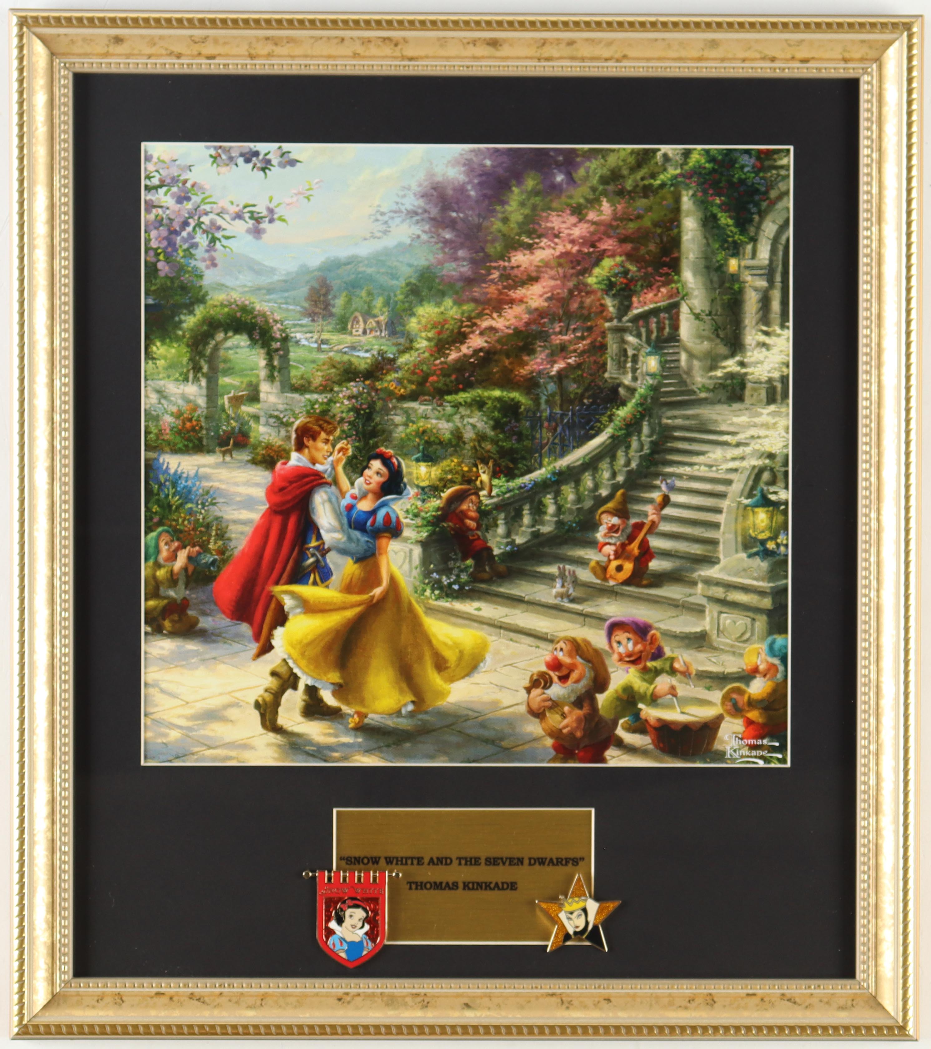Custom frame measures approximately 16" x 18" in size and features a Thomas Kinkade "Snow White And The Seven Dwarfs" print and also includes a Vintage Snow White and Wicked Queen Character Pins.