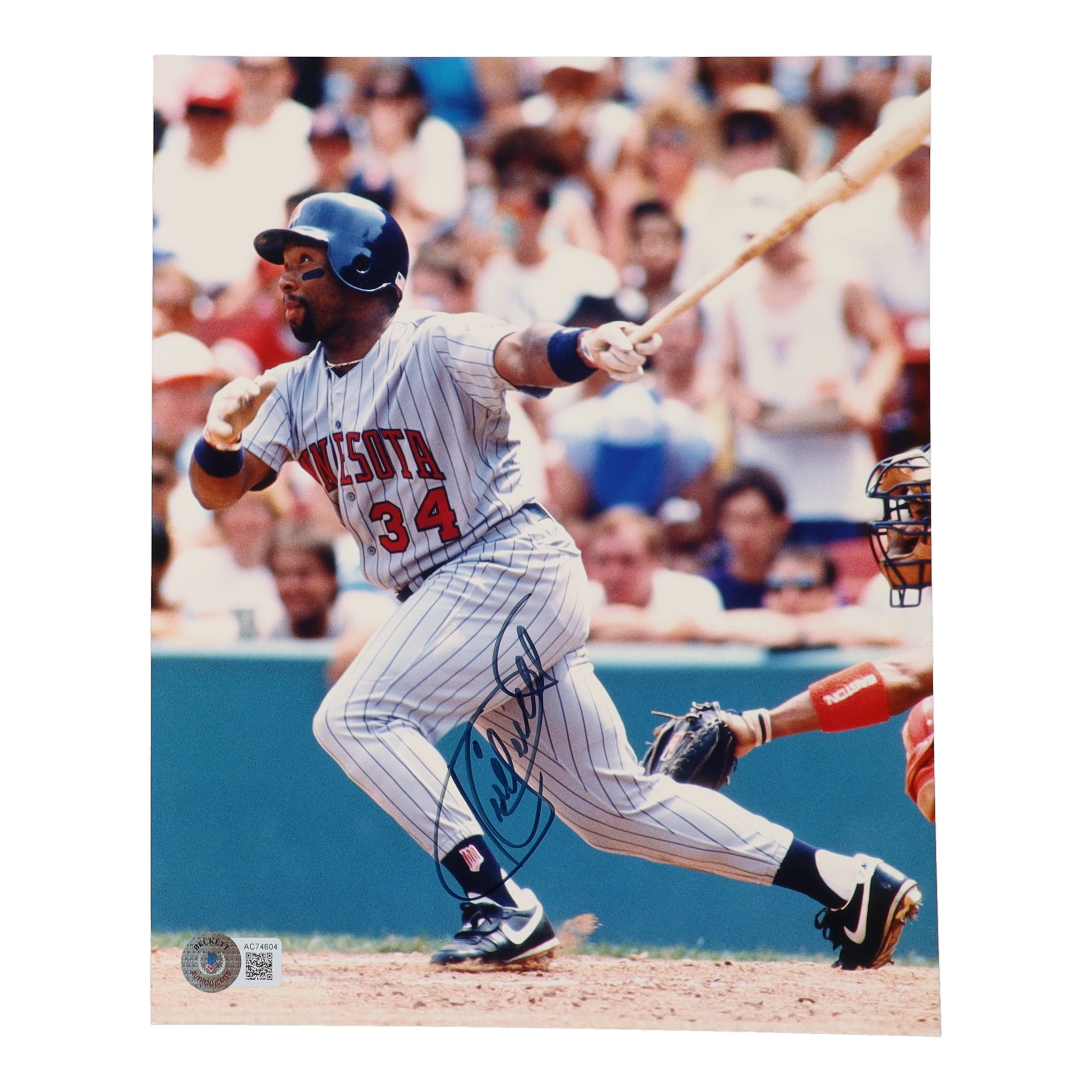 Photo measures 8" x 10" in size and has been hand-signed by Kirby Puckett (D. 2006, Minnesota Twins, HOF).