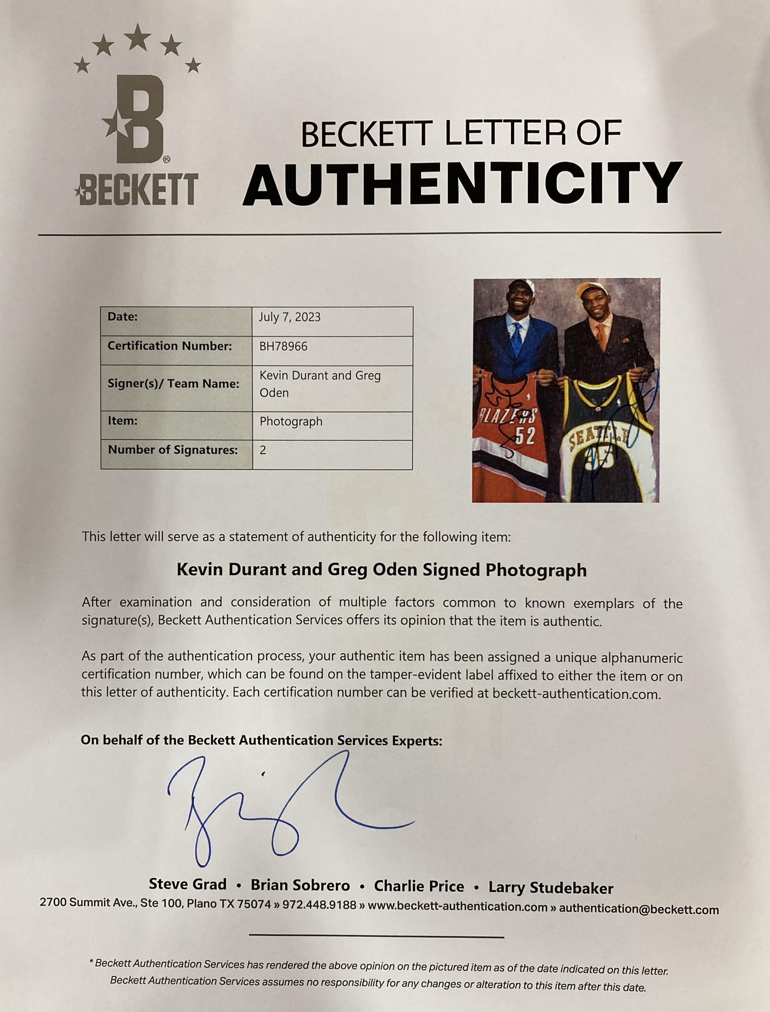 Custom framed photo display measures approximately 11" x 14" in size. Features a photo that has been hand-signed by Kevin Durant (Seattle SuperSonics) and Greg Oden (Portland Trail Blazers).