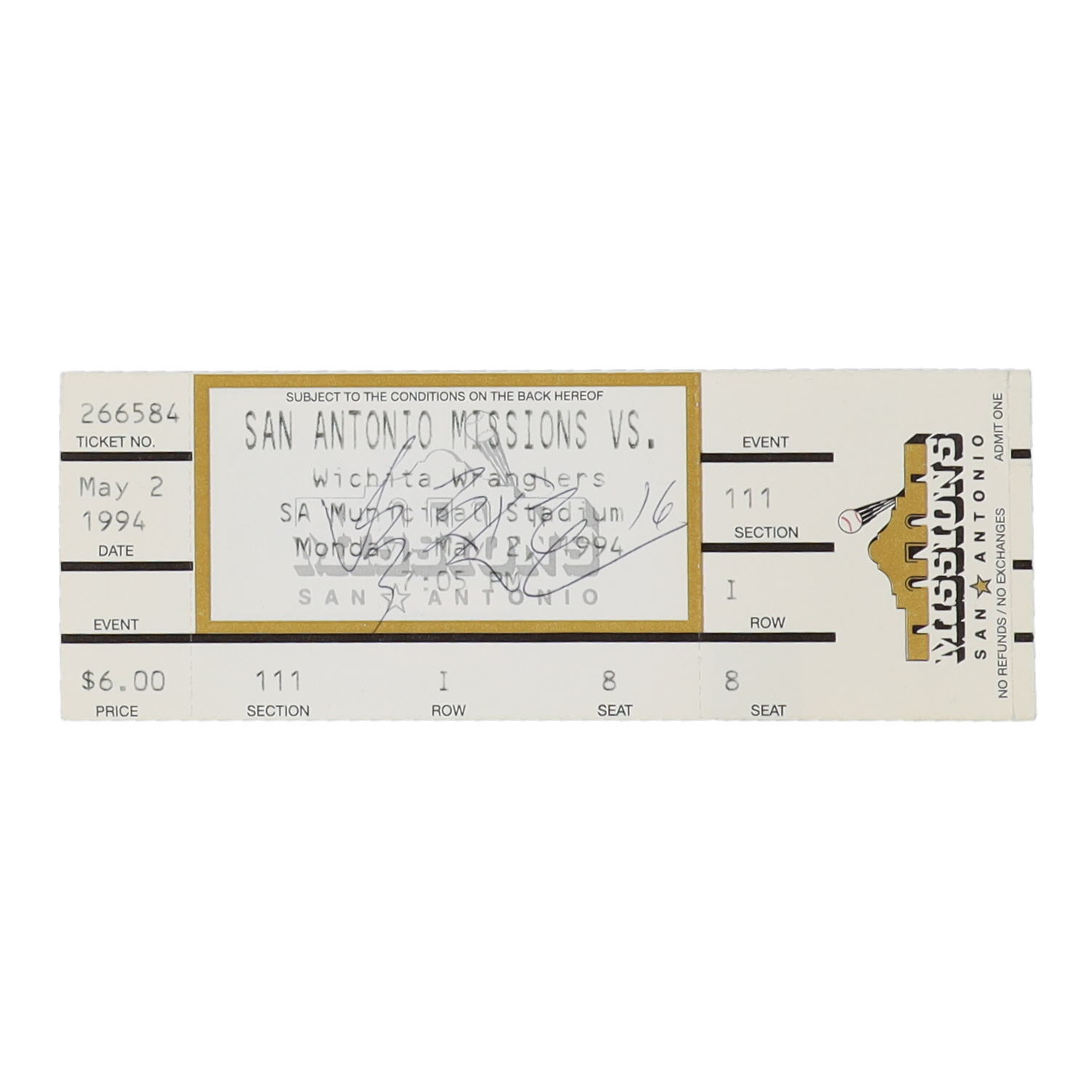 Ticket dated May 2, 1994 has been hand-signed by Chan Ho Park.