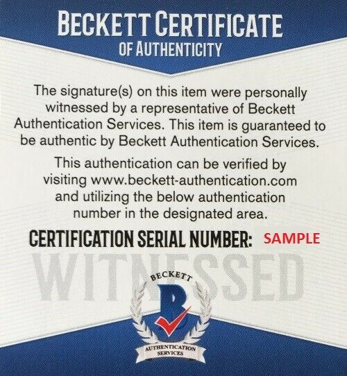 The lot / autograph(s) includes an official Beckett Authentication Services serially-numbered hologram and matching COA for authenticity purposes. The signing of this item was witnessed by Beckett.