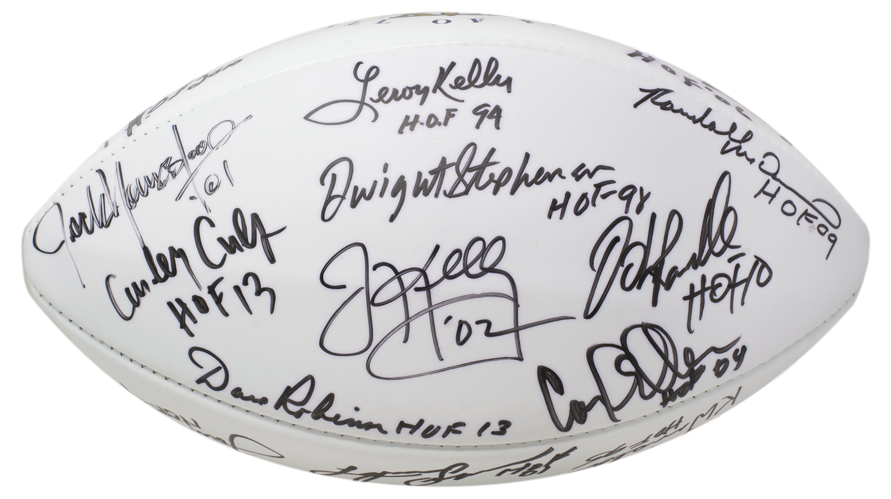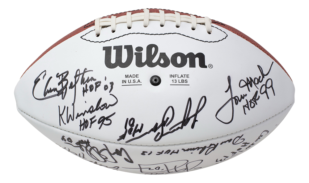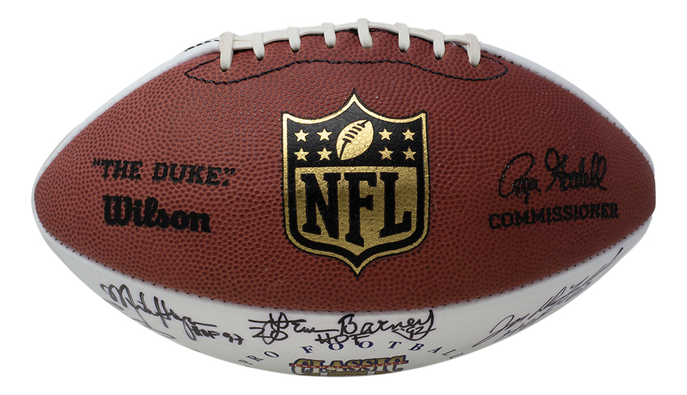 NFL "The Duke" Wilson Hall of Fame XIX Golf Classic Football. Hand-signed and inscribed by Lem Barney, Elvin Bethea, Curley Cult, Carl Elder, Mike Haynes, Jim Kelly, Leroy Kelly, Floyd Little, Tom Mack, Randall McDaniel, John Randle, Dave Robinson, Lynn Swann, Kellen Winslow, Rayfield Wright, Jack Youngblood and (2) others. See photos for more details.