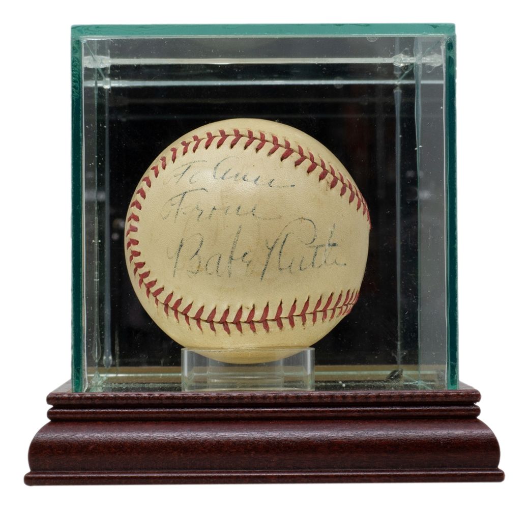 Reach Official American League Baseball. Baseball has been hand-signed by Babe Ruth (D. 1948, New York Yankees, HOF). The display case is included as shown. Please note, the baseball is naturally toned, shows signs of natural aging and the inscription has been personalized, "To Ann From".