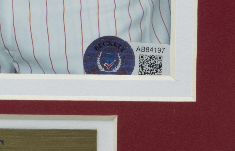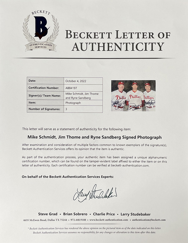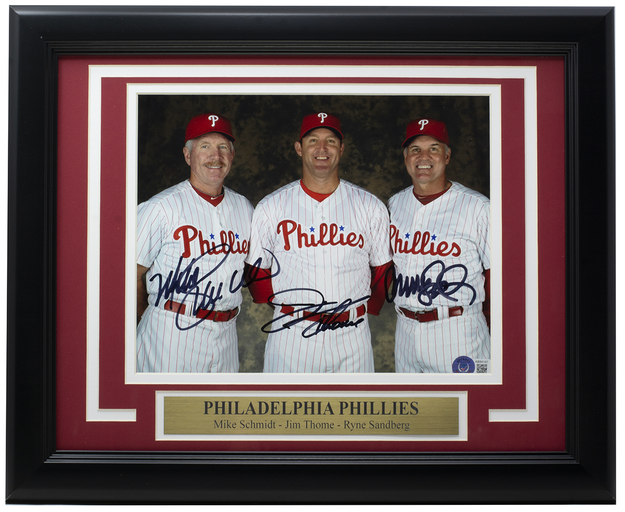 Custom frame measures 11" x 14" in size and features a photo that has been hand-signed by Mike Schmidt (HOF), Jim Thome (HOF) and Ryne Sandberg (HOF).