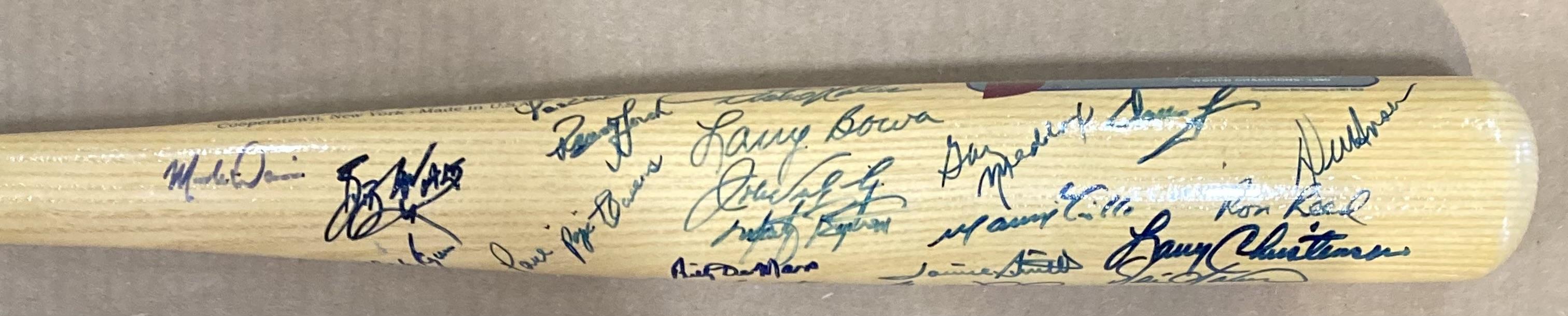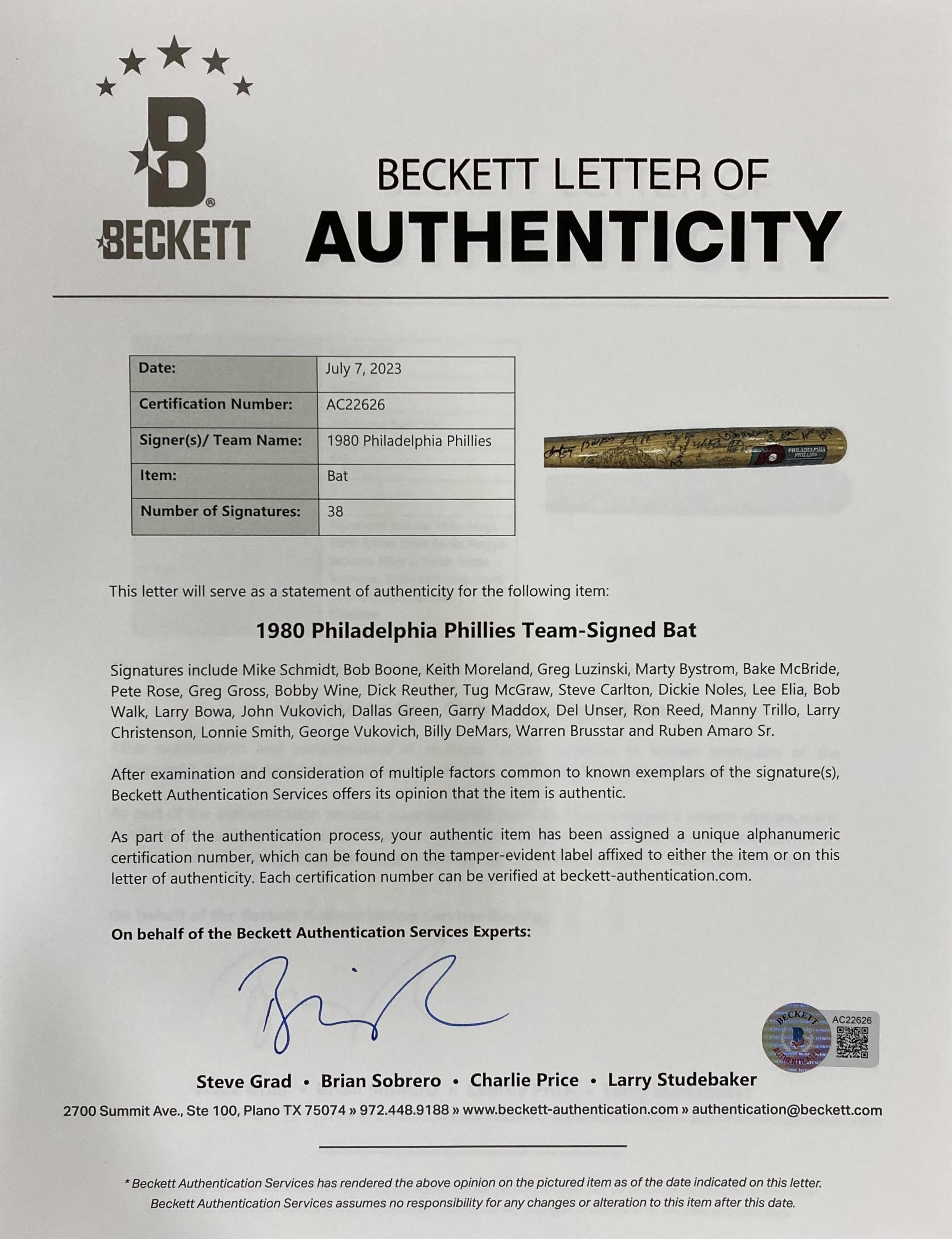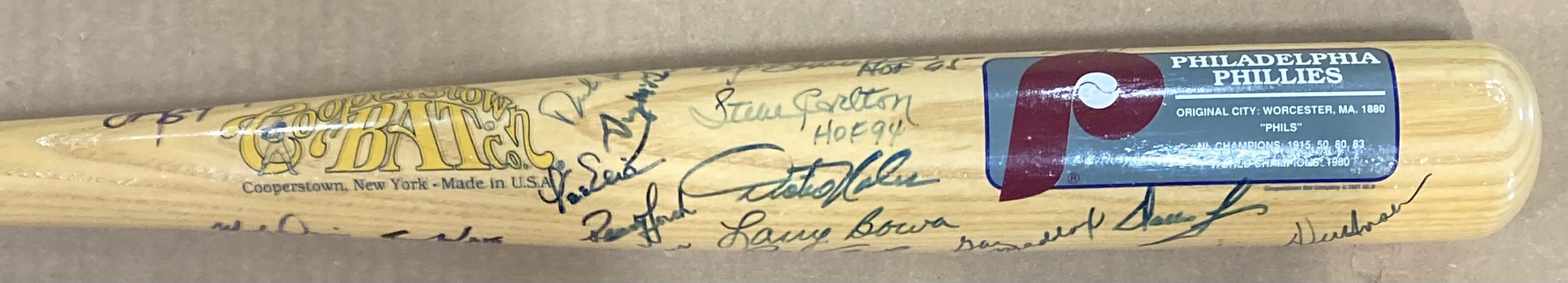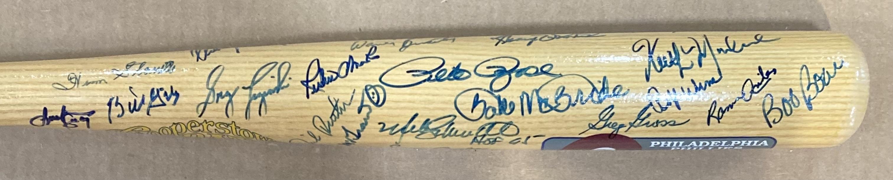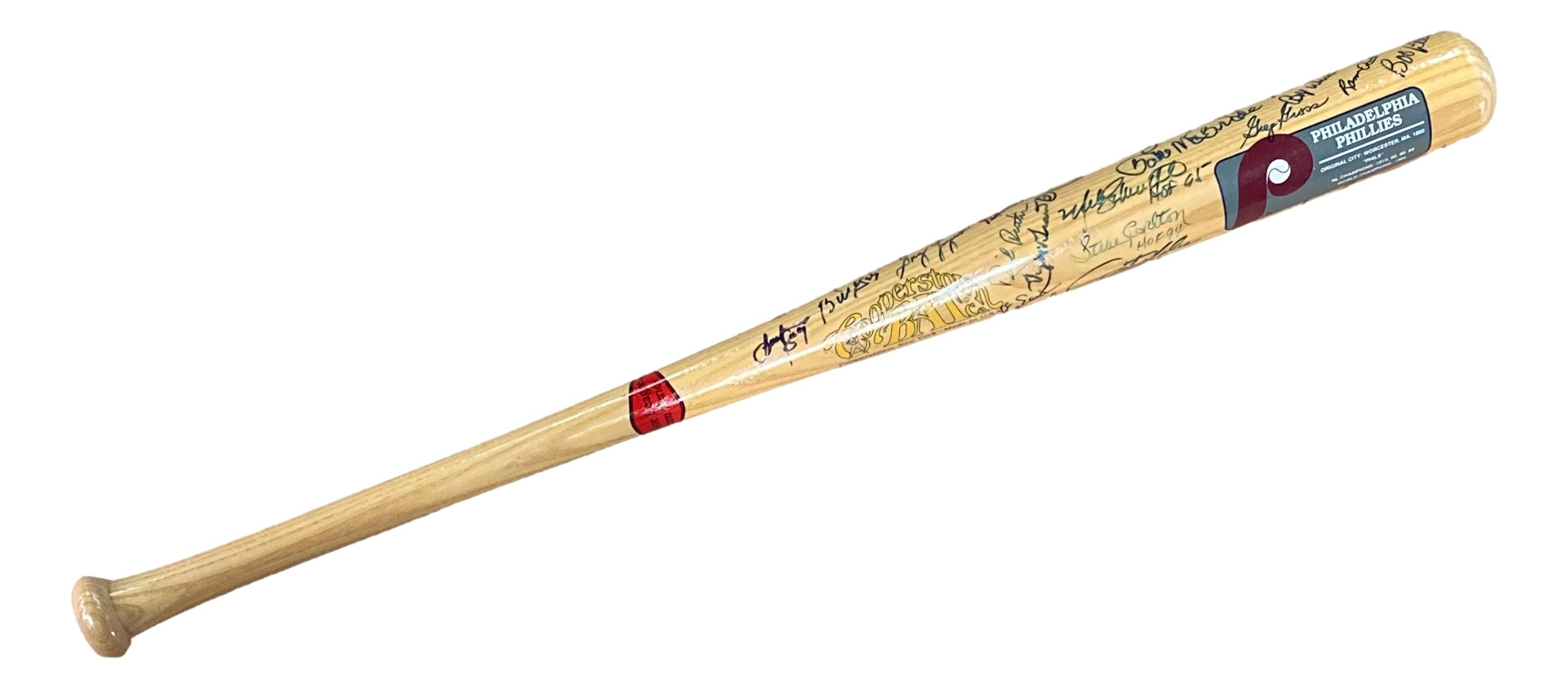 Cooperstown commemorative Philadelphia Phillies baseball bat has been hand-signed by (38) members of the 1980 team. Signers include Mike Schmidt, Bob Boone, Keith Moreland, Greg Luzinski, Marty Bystrom, Bake McBride, Pete Rose, Gabe Gross, Bobby Wine, Dick Reuther, Tug McGraw, Steve Carlton, Dickie Noles, Lee Elia, Bob Walk, Larry Bowa, John Vukovich, Dallas Green, Gary Maddox, Del Unser, Ron Reed, Manny Trillo, Larry Christenson, Lonnie Smith, George Vukovich, Billy DeMars, Warren Brusstar and Ruben Amaro Sr.