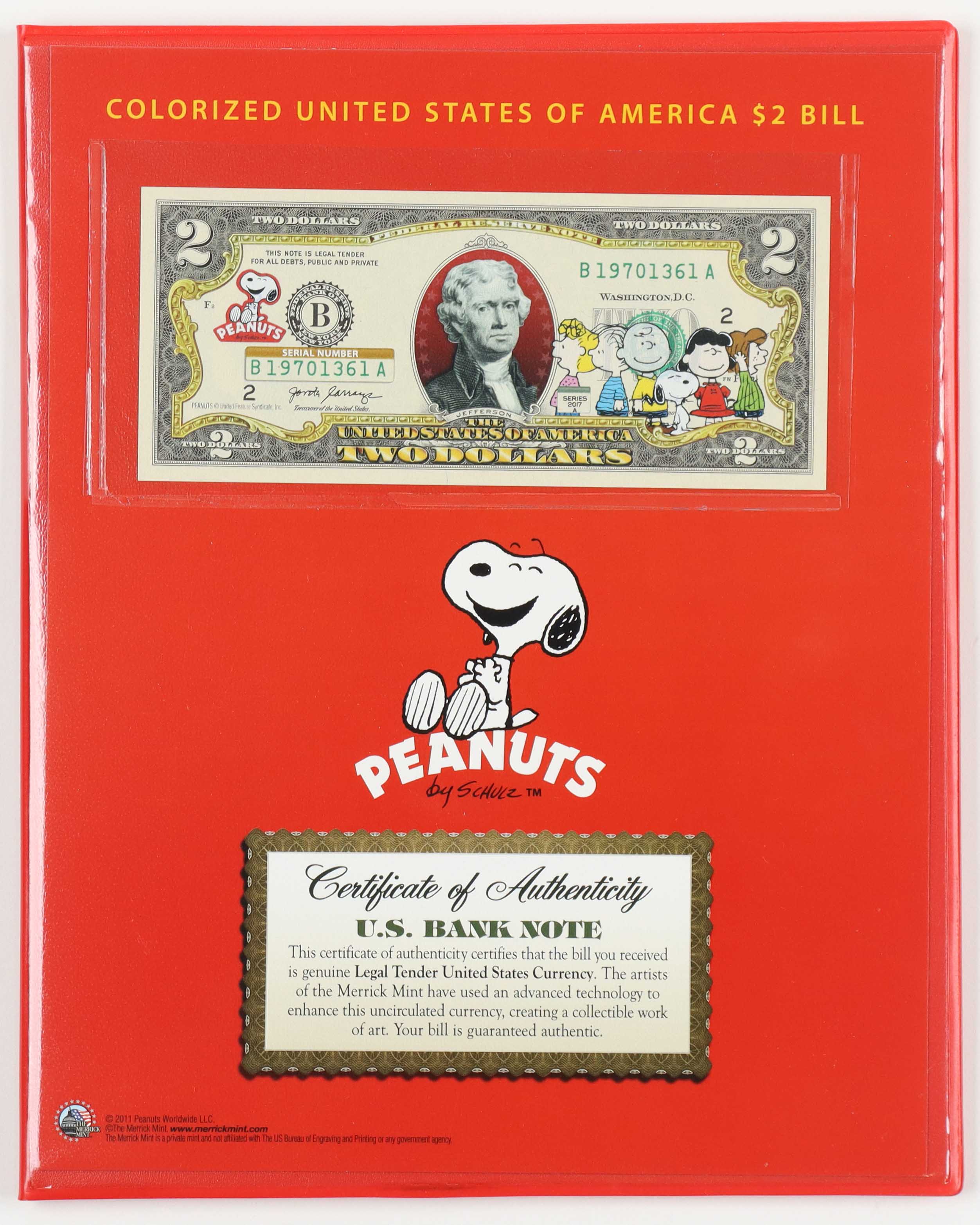Peanuts Genuine Legal Tender U.S. $2.00 Two Dollar Bill Commemorative Edition Bank Note with Folder