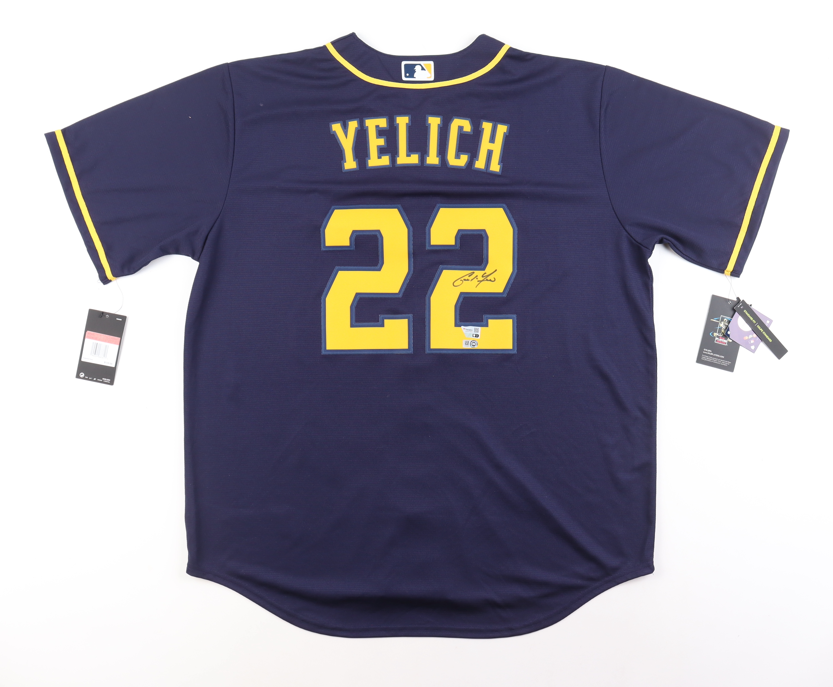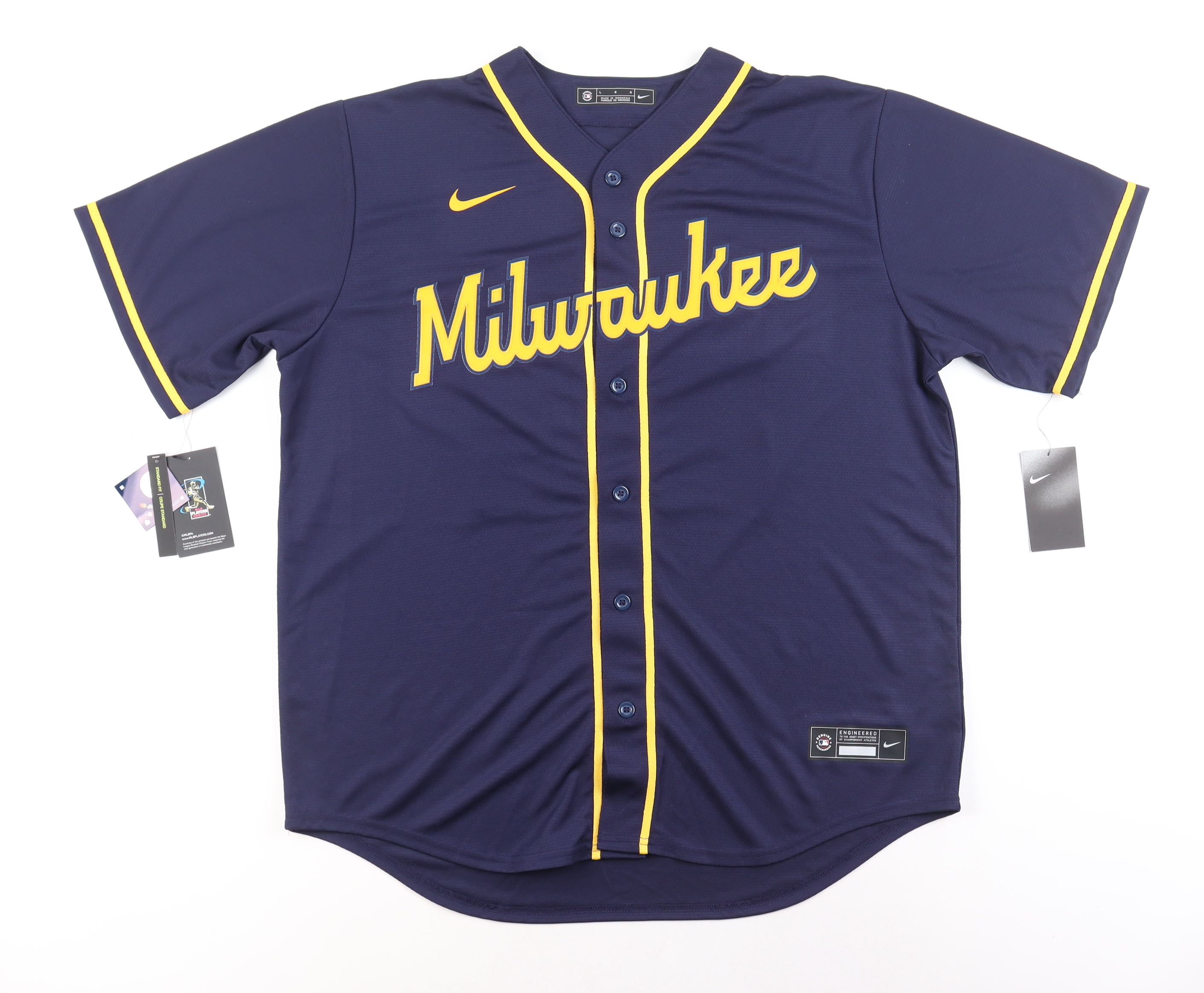 Nike jersey with everything pressed on, size L. Hand-signed by Christian Yelich (Milwaukee Brewers).