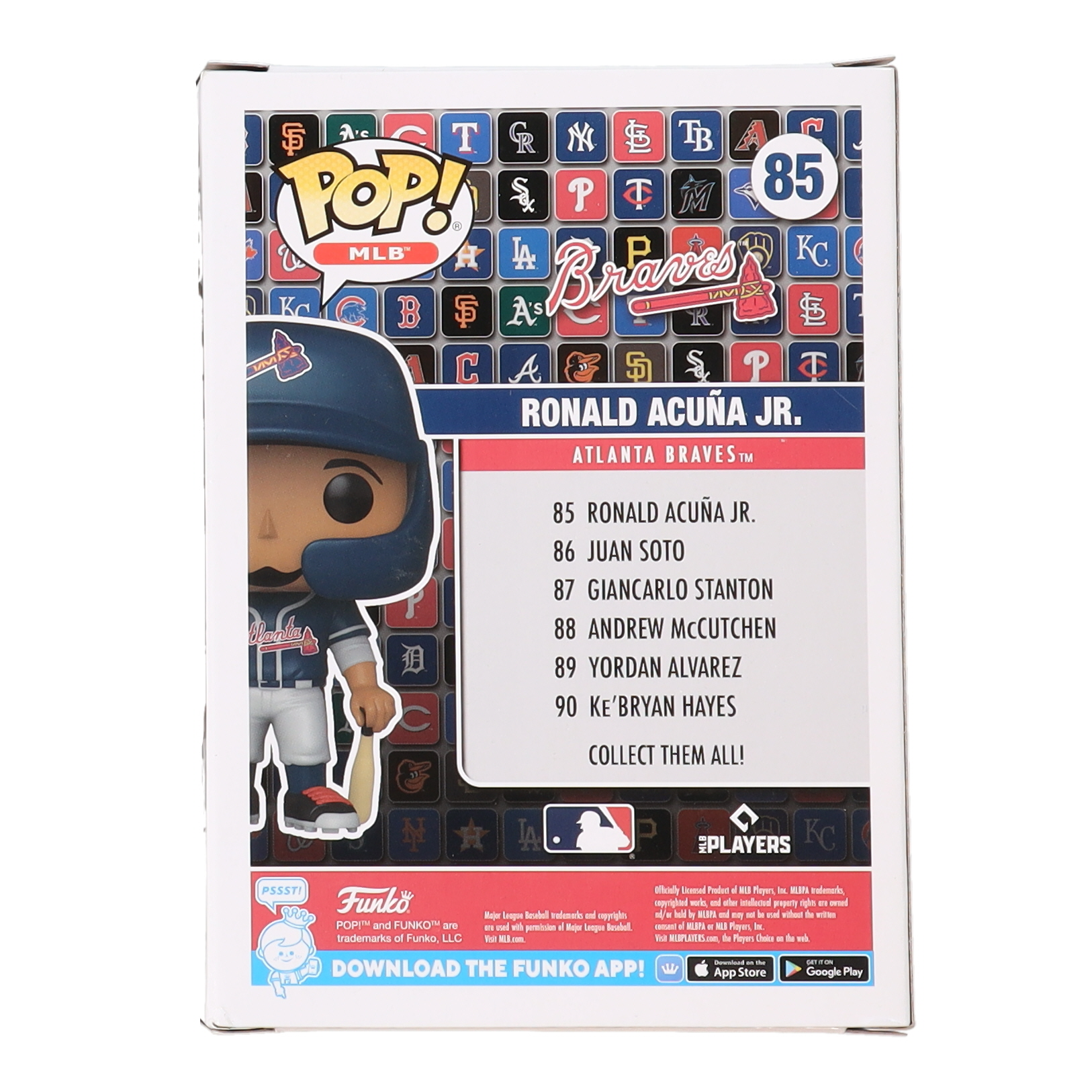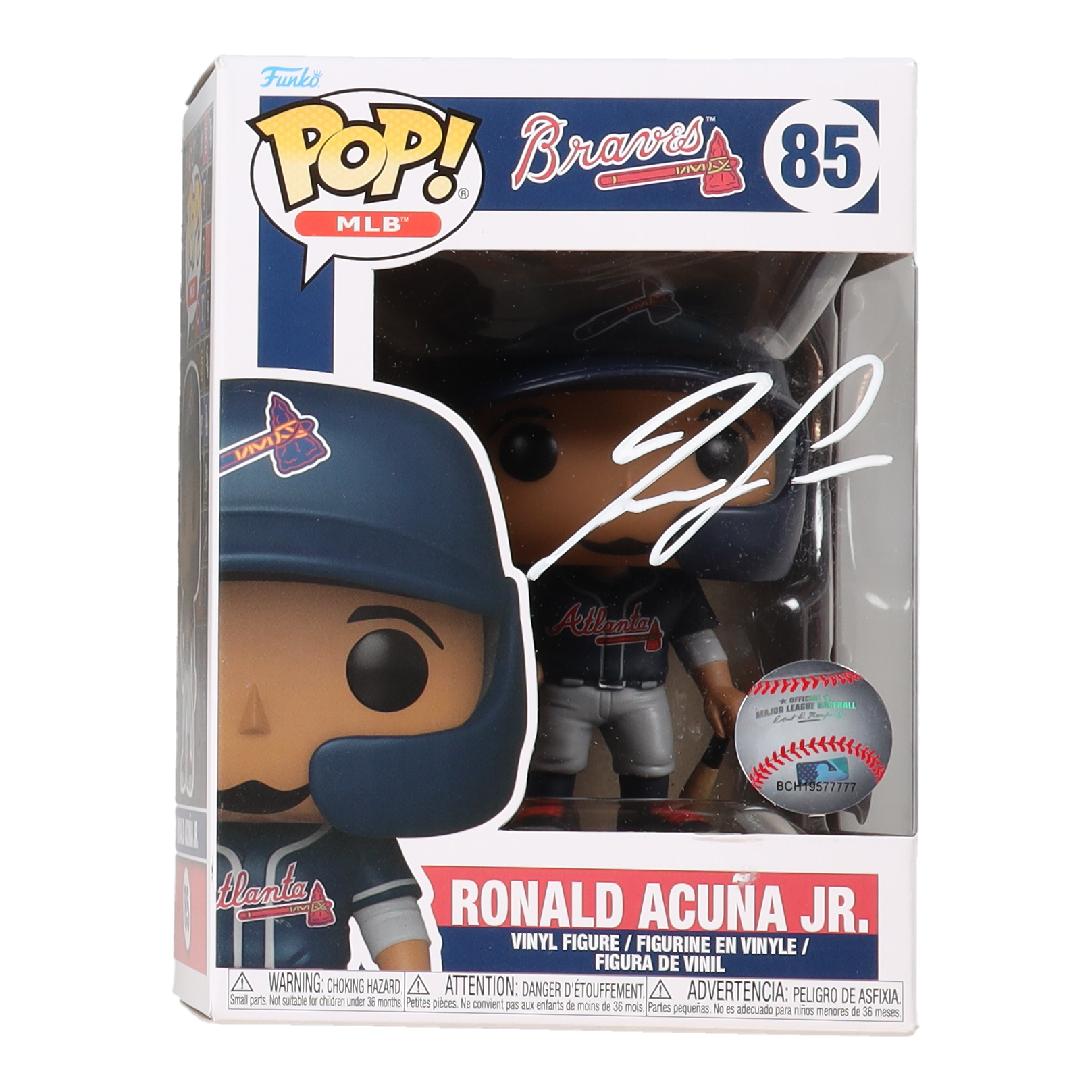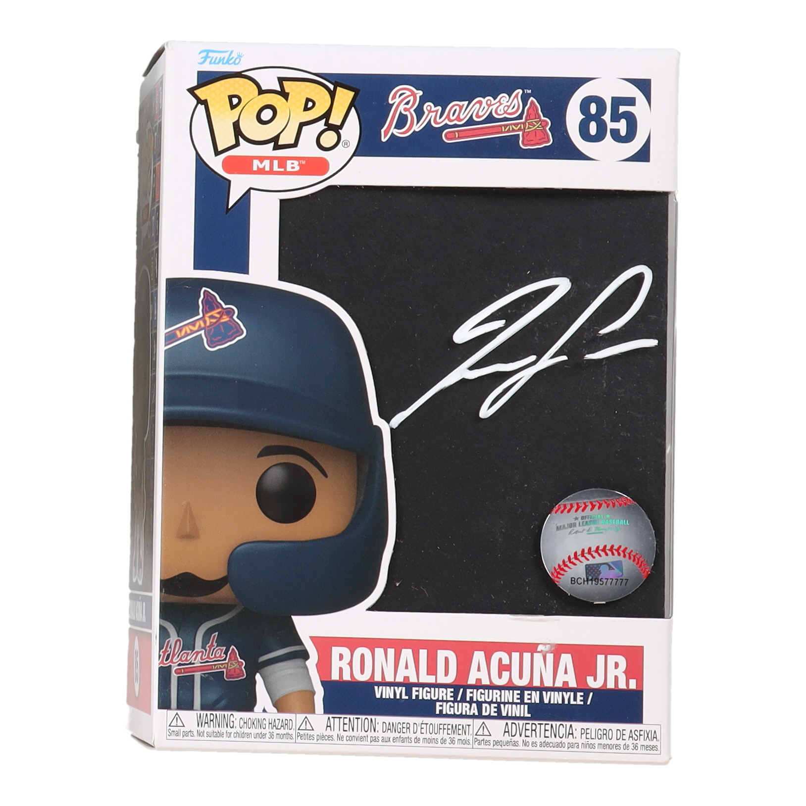Funko Pop! figure measures approximately 4" tall and has been hand-signed on the packaging by Ronald Acuna Jr. (Atlanta Braves).