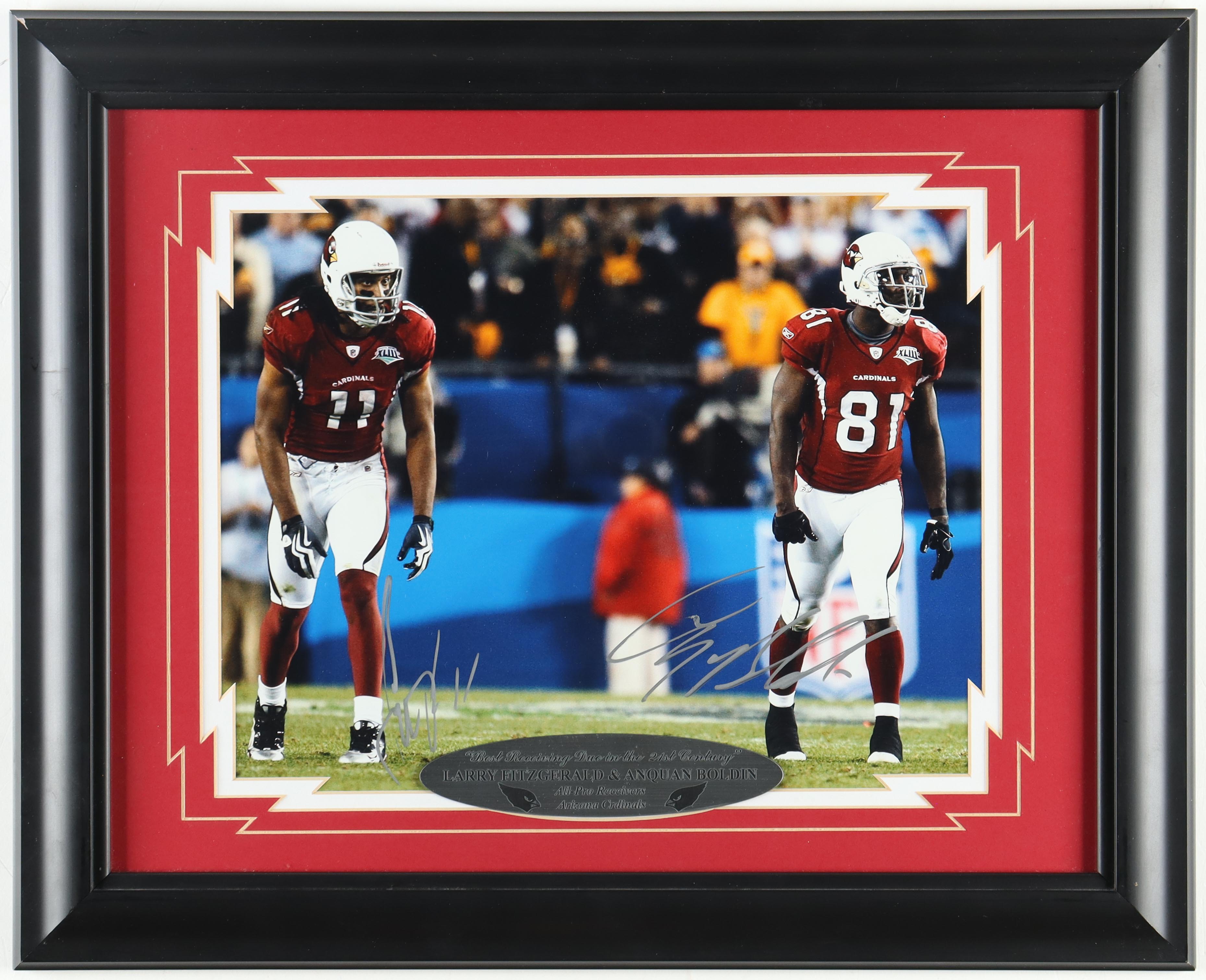Custom framed display measures 17" x 21" in size and features a photo that has been hand-signed by Larry Fitzgerald and Anquan Boldin (Arizona Cardinals).