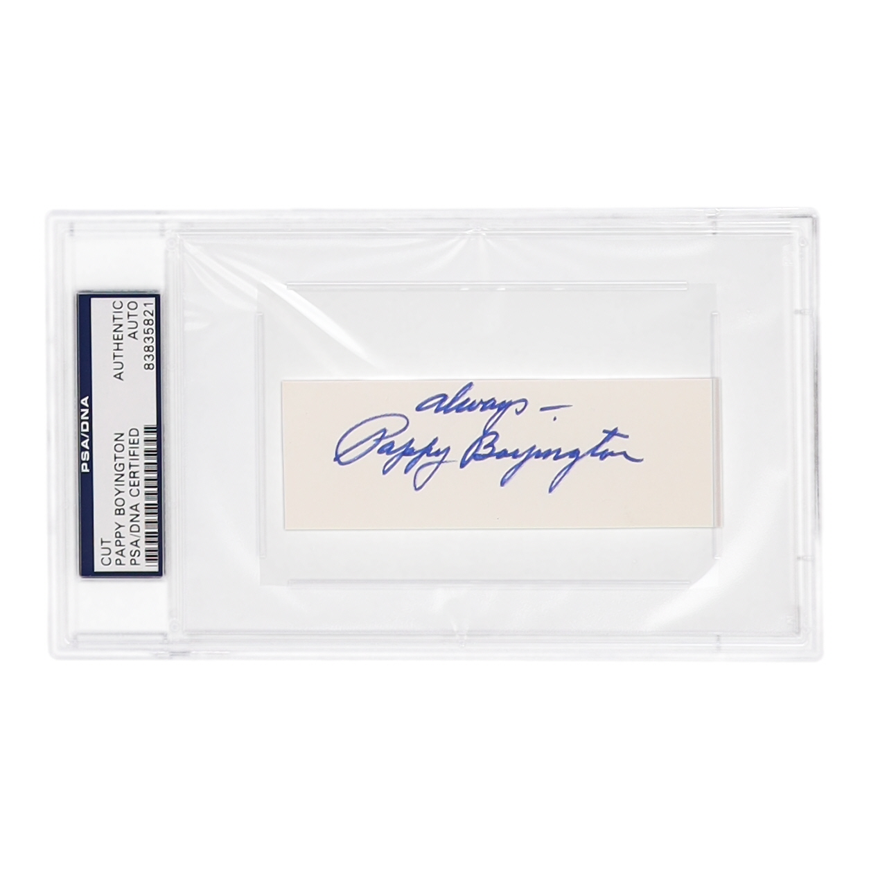 Cut measures 2" x 4" in size and has been hand-signed and inscribed by Pappy Boyington (D. 1988).