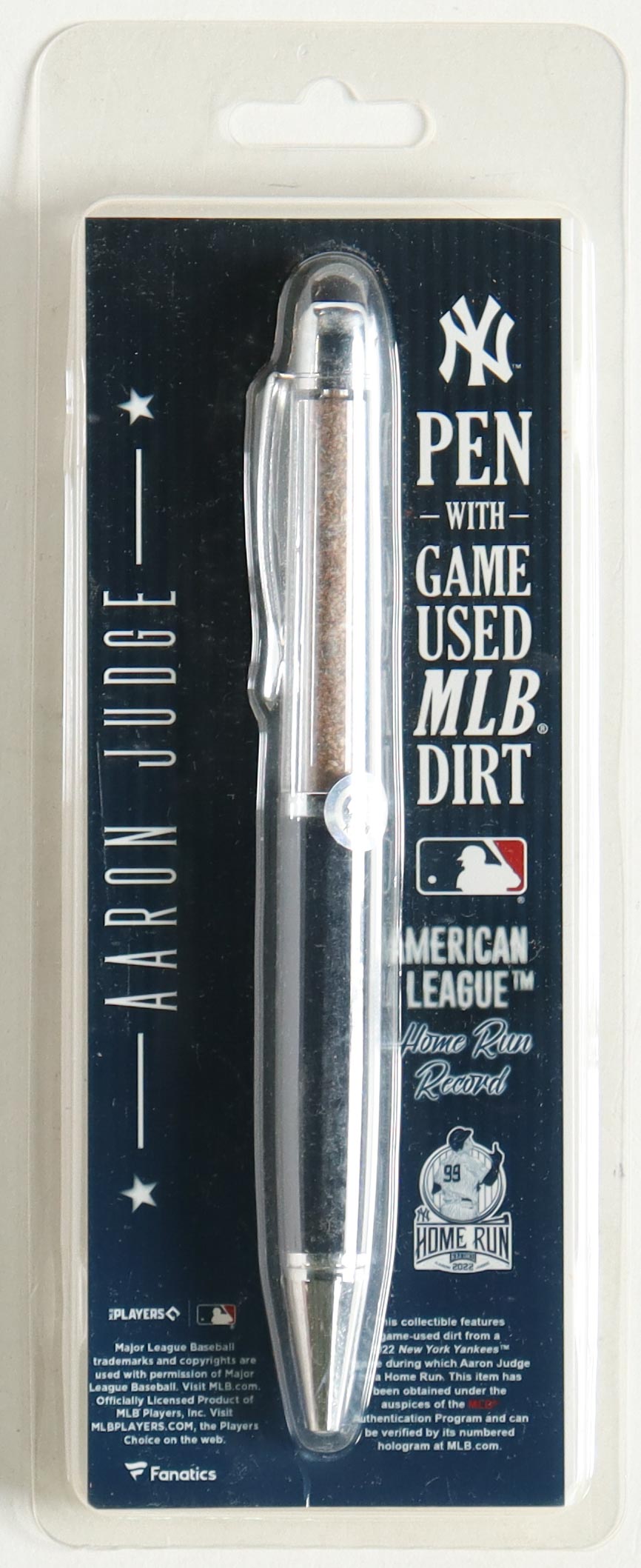 This Pen includes dirt from a New York Yankees game during which Aaron Judge hit a home run and then obtained under the auspices of the MLB Authentication Program and can be verified by its numbered hologram at MLB.com.