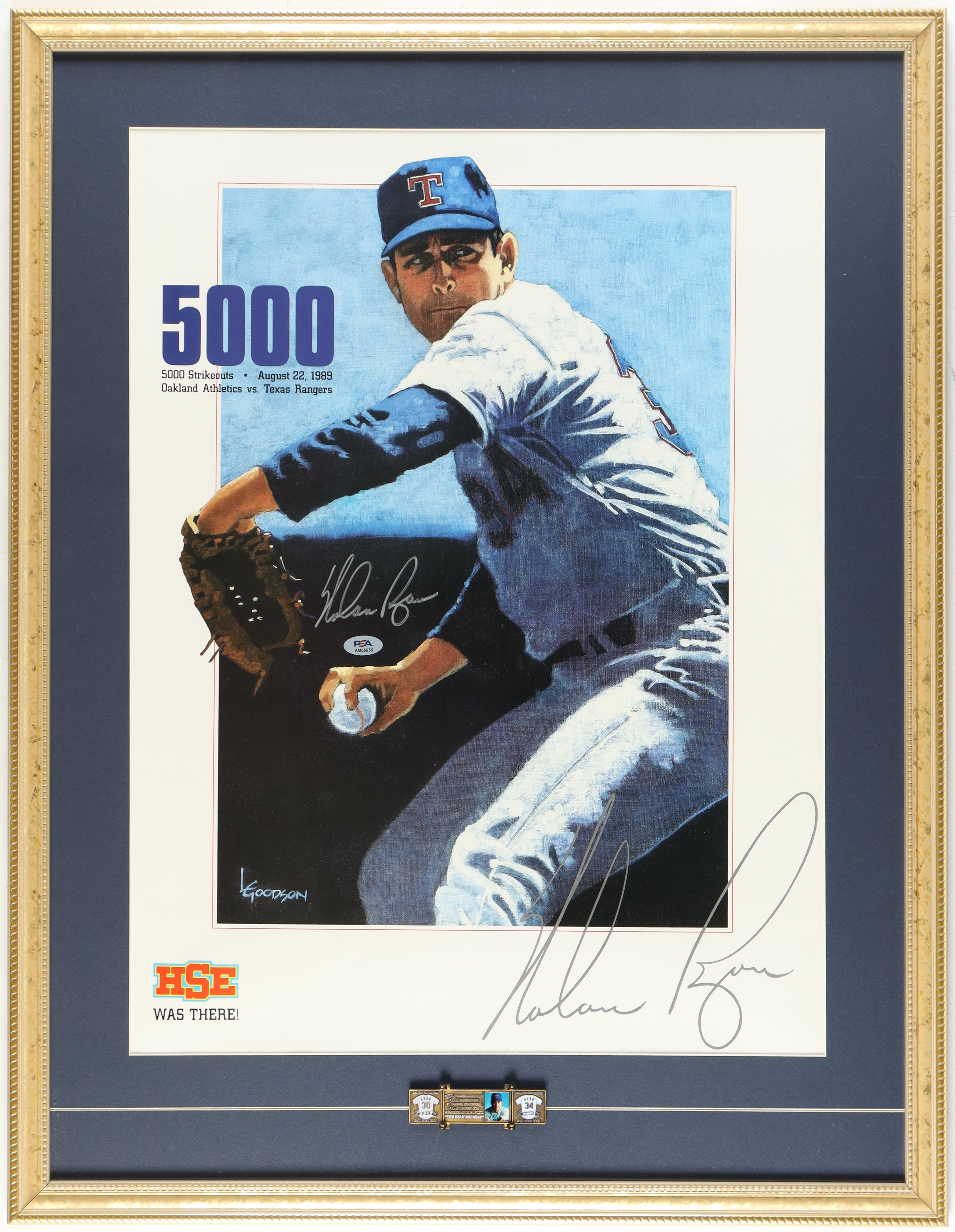 Nolan Ryan Signed 1989 Rangers 5000 Strikeout Custom Framed Art Print Display With Bronze Career Plaque Pin (PSA)