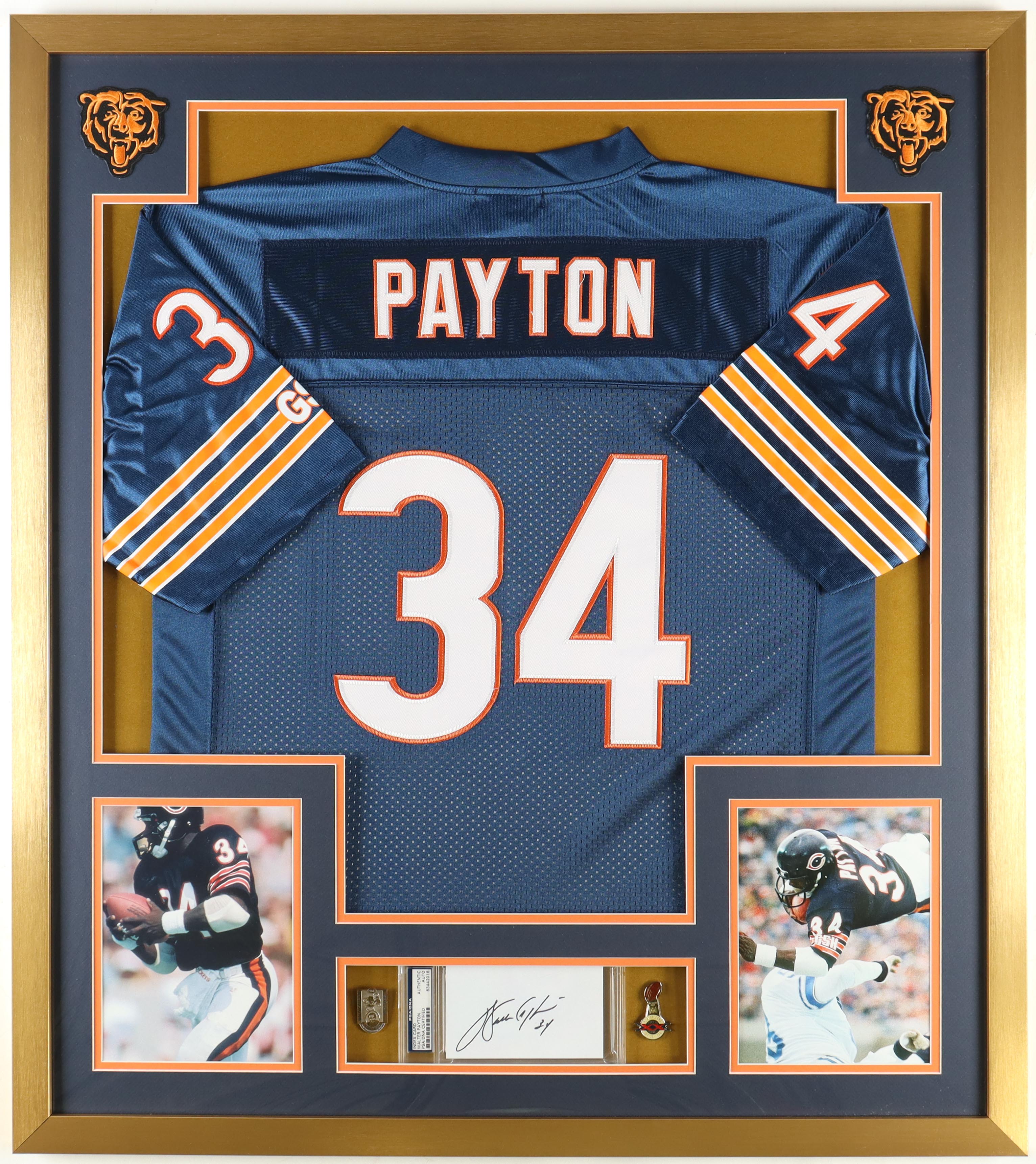 Walter Payton Signed Bears Custom Framed Cut Display with Jersey, Official Retirement & Super Bowl XX Championship Pin (PSA)