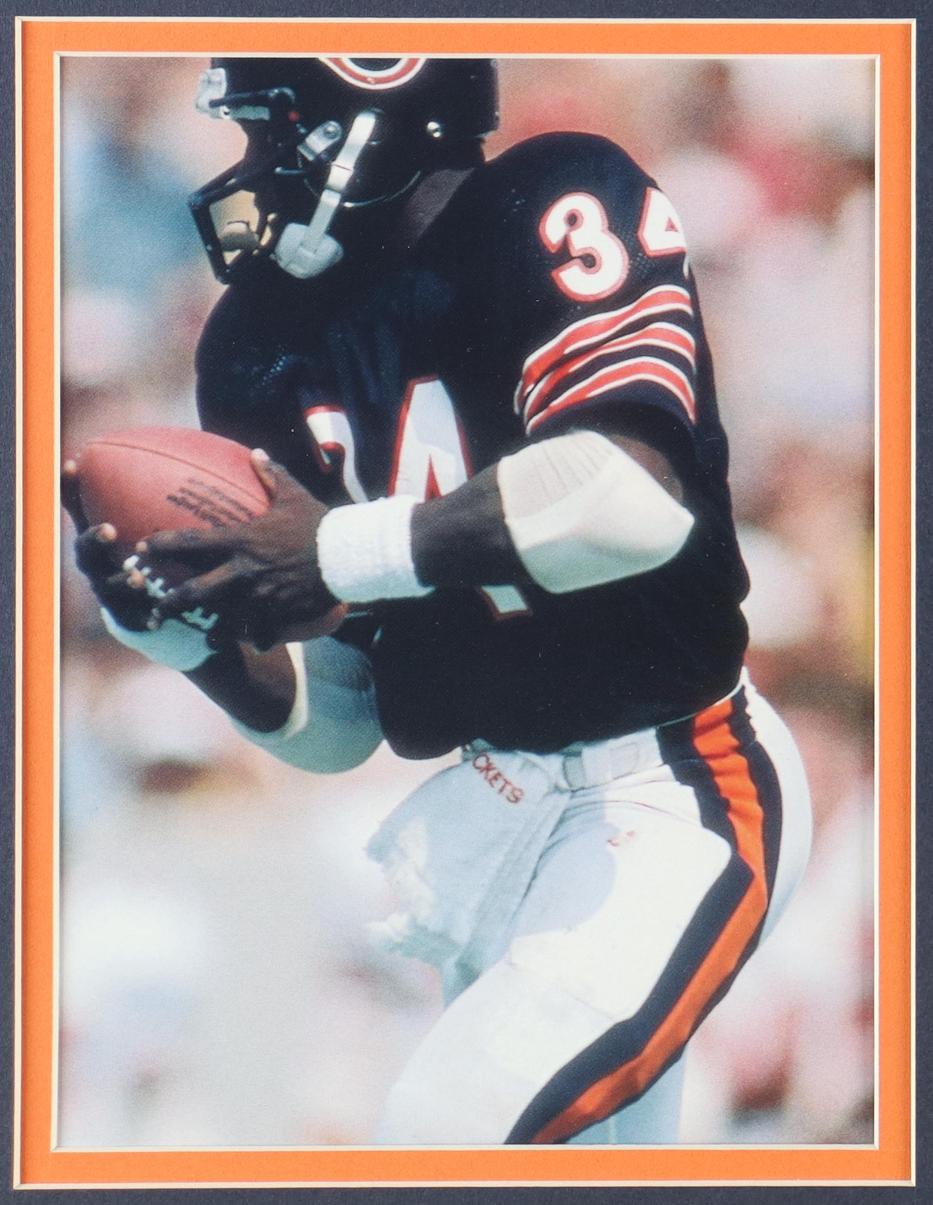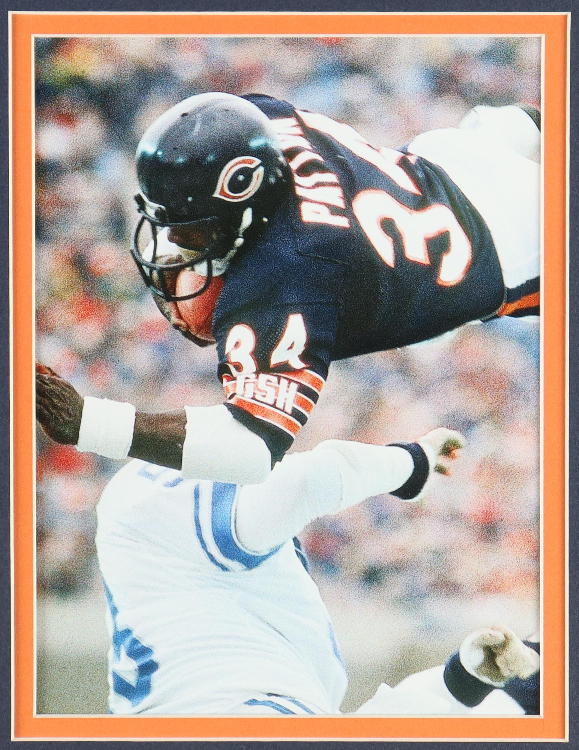 Custom frame measures approximately 32" x 36" in size and and features a cut that has been hand-signed by Walter Payton (D. 1999, Chicago Bears, HOF). The display also includes an unsigned jersey and Official Retirement and Super Bowl XX Championship Pins.