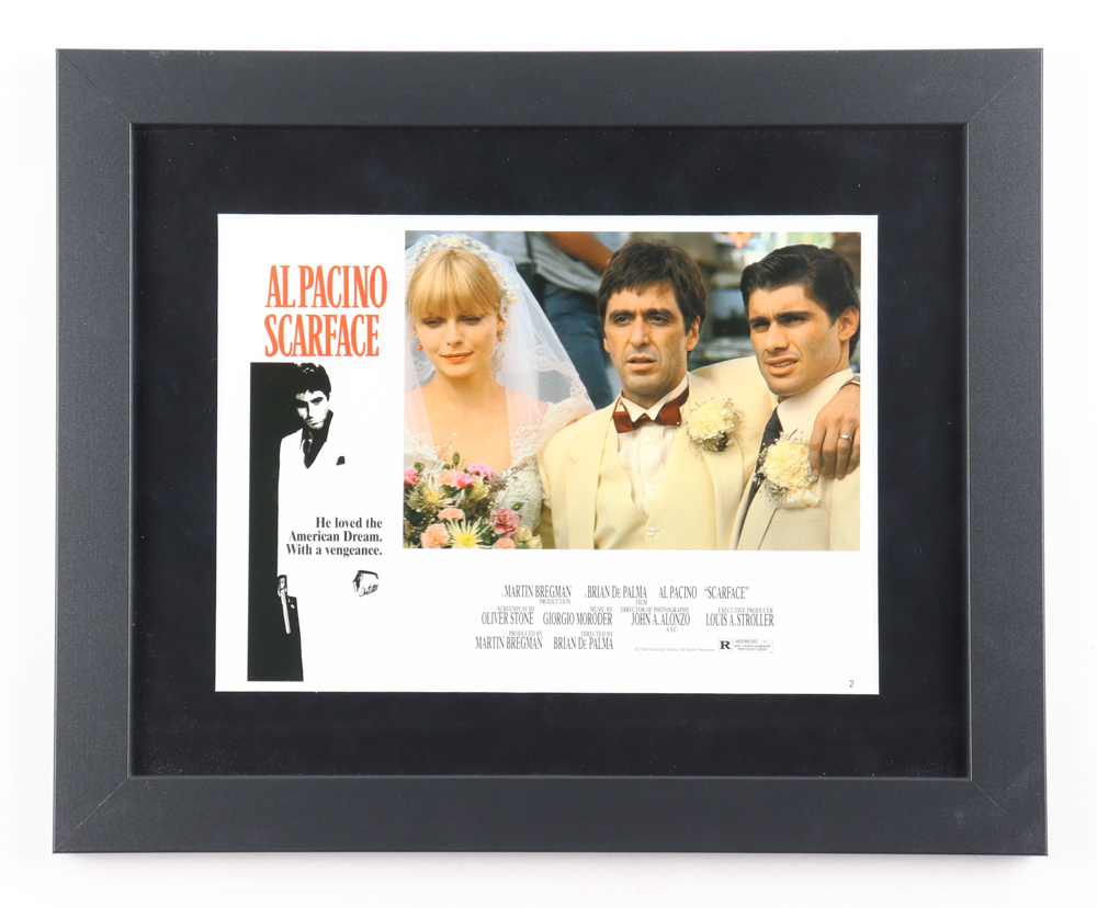 Custom frame measures approximately 13" x 16" in size and features a matted Lobby Card featuring Al Pacino (Tony Montana) in "Scarface". Please note that the display is unsigned.