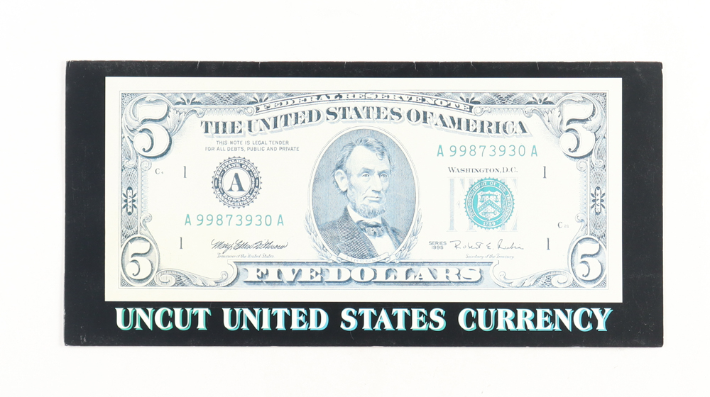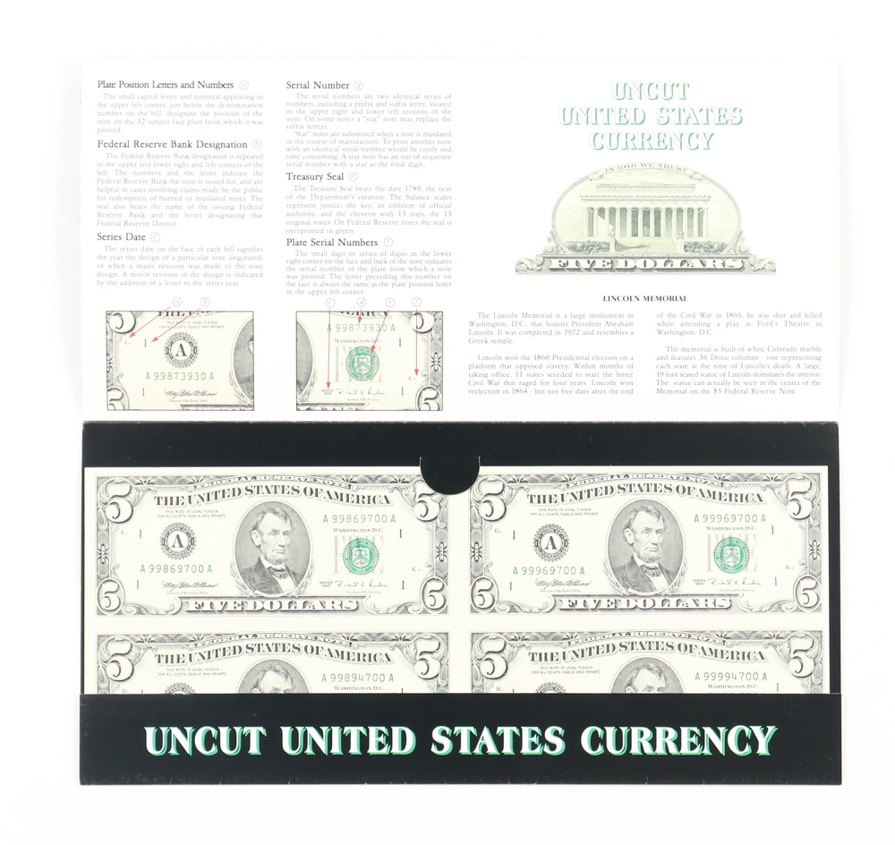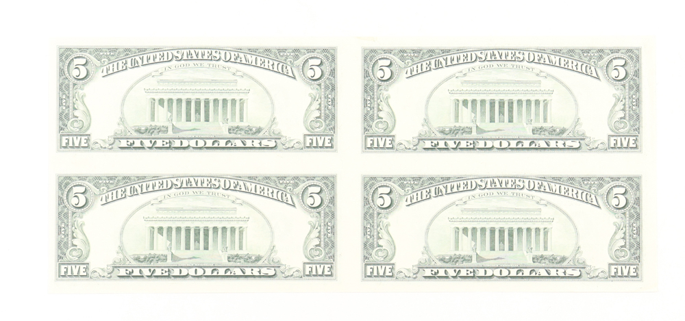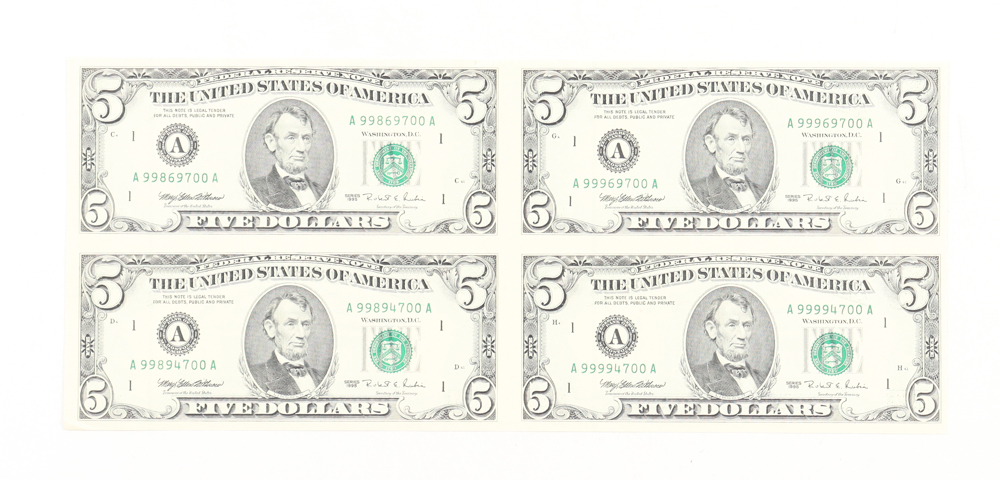 Uncut Sheet of (4) 1995 $5 Five-Dollar U.S. Federal Reserve Notes