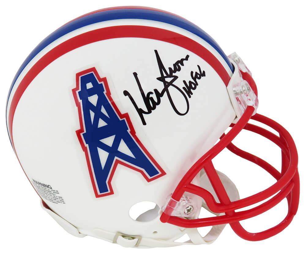 Riddell Houston Oilers throwback mini helmet. Hand-signed and inscribed by Warren Moon (HOF).
