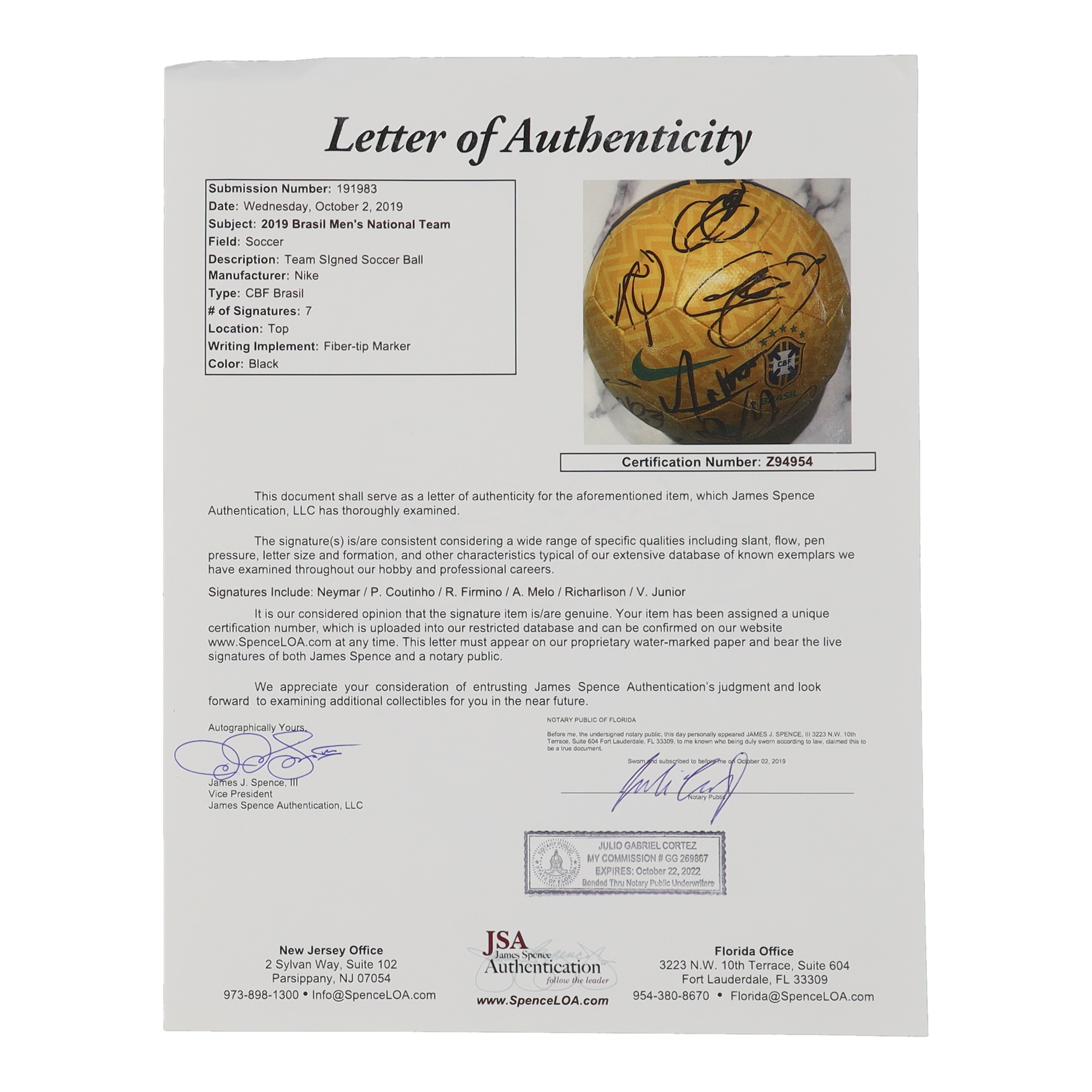 2019 Brazil Men's National Team Brazil Logo Soccer Ball Signed By (7) With Neymar Jr., Vinicius Junior, Thiago Silva, Richarlison (JSA)