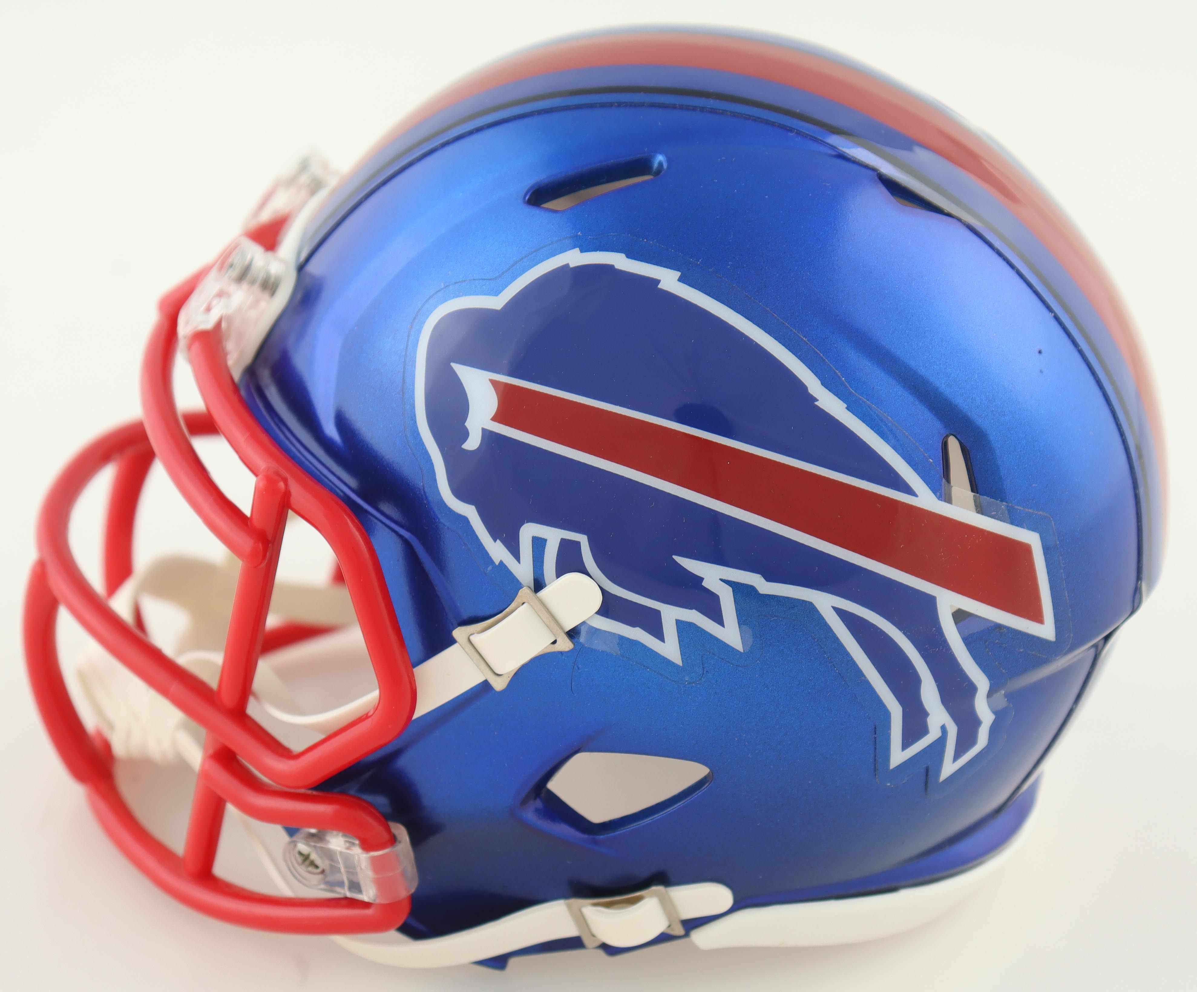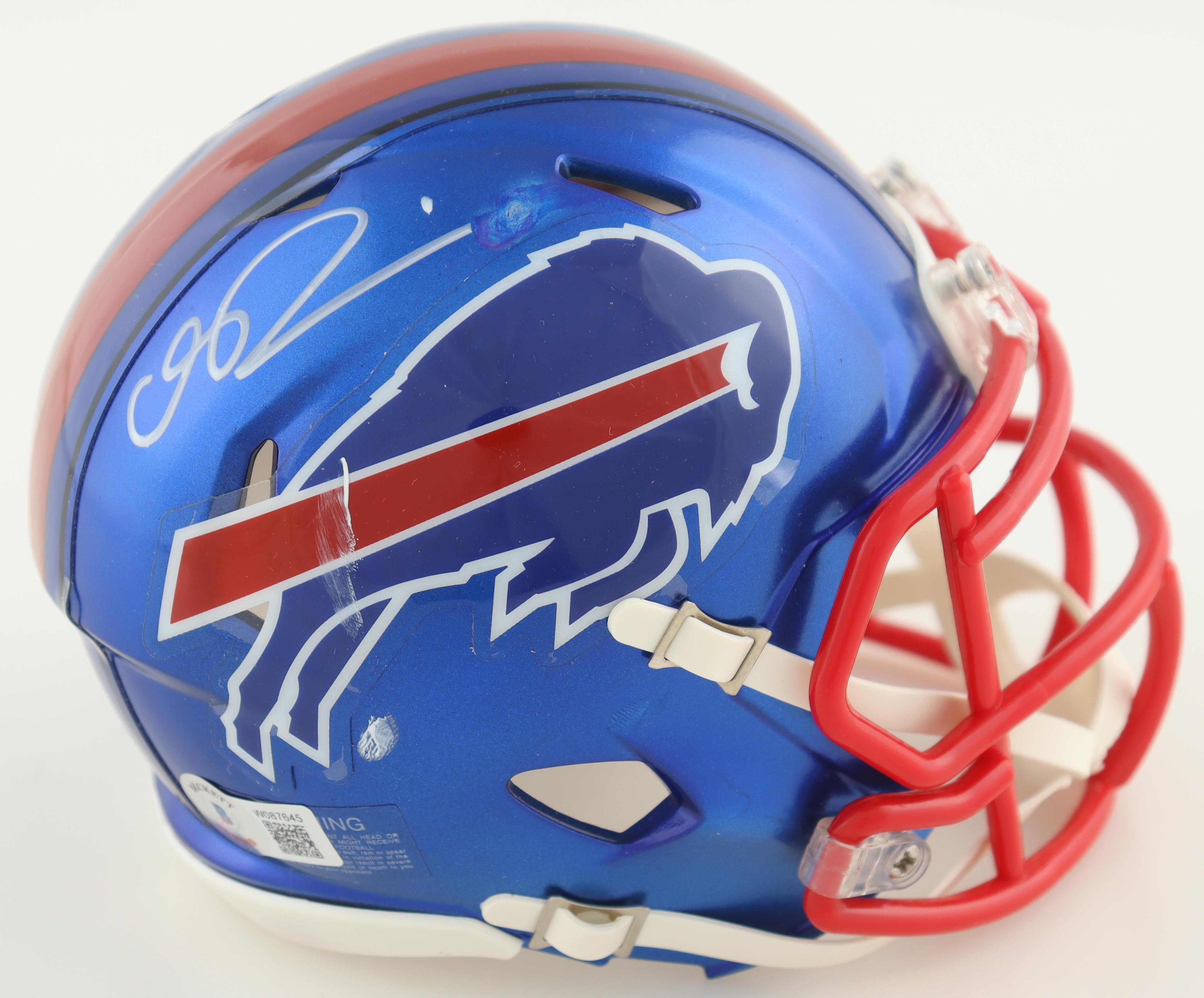 Riddell Buffalo Bills Flash Alternate Speed mini helmet. Hand-signed by Gabe Davis. Please note slight pen marks below the signature.