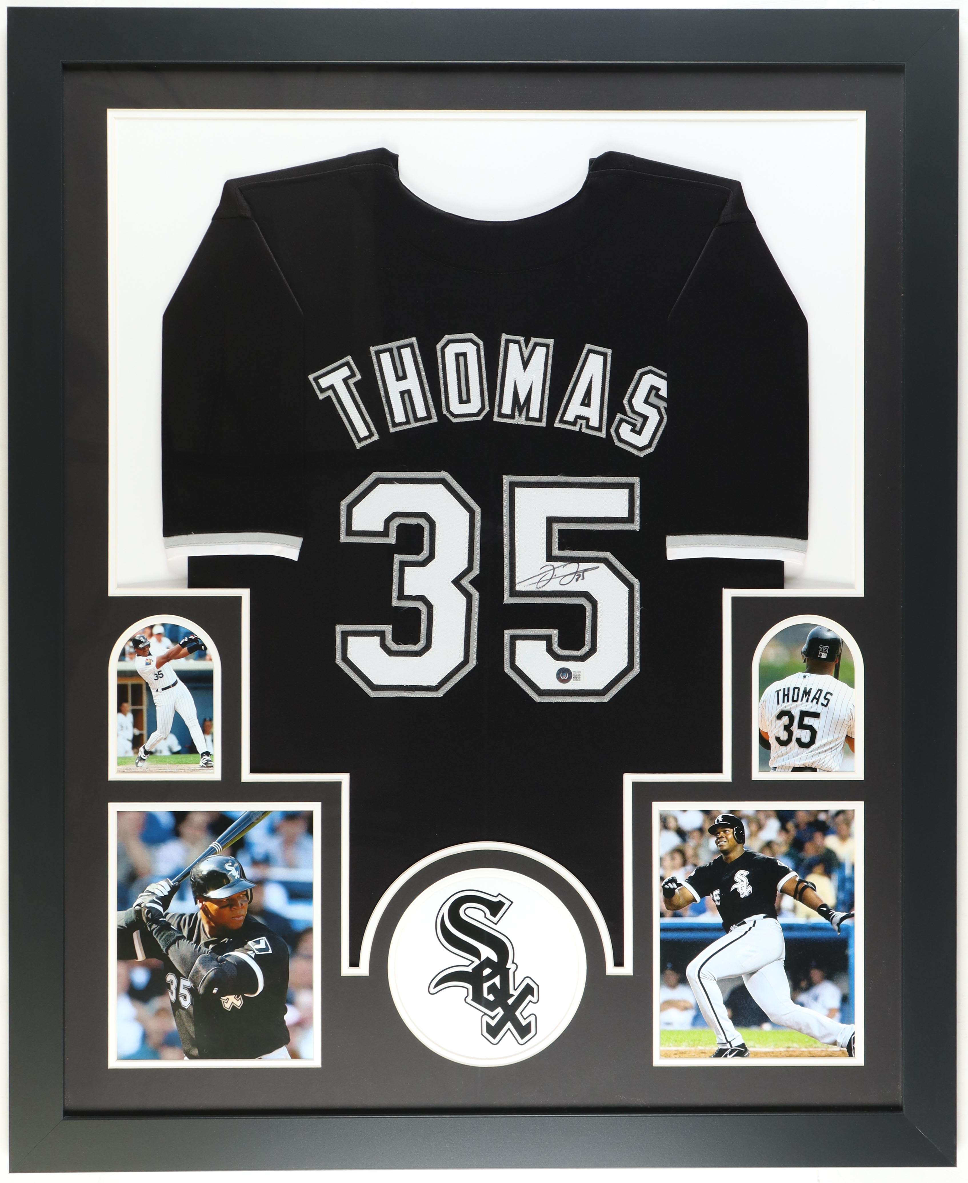 Custom frame measures 35" x 43" in size and features a jersey hand-signed by Frank Thomas (HOF). Please note that the 8" x 10" photos may be in reverse order.
