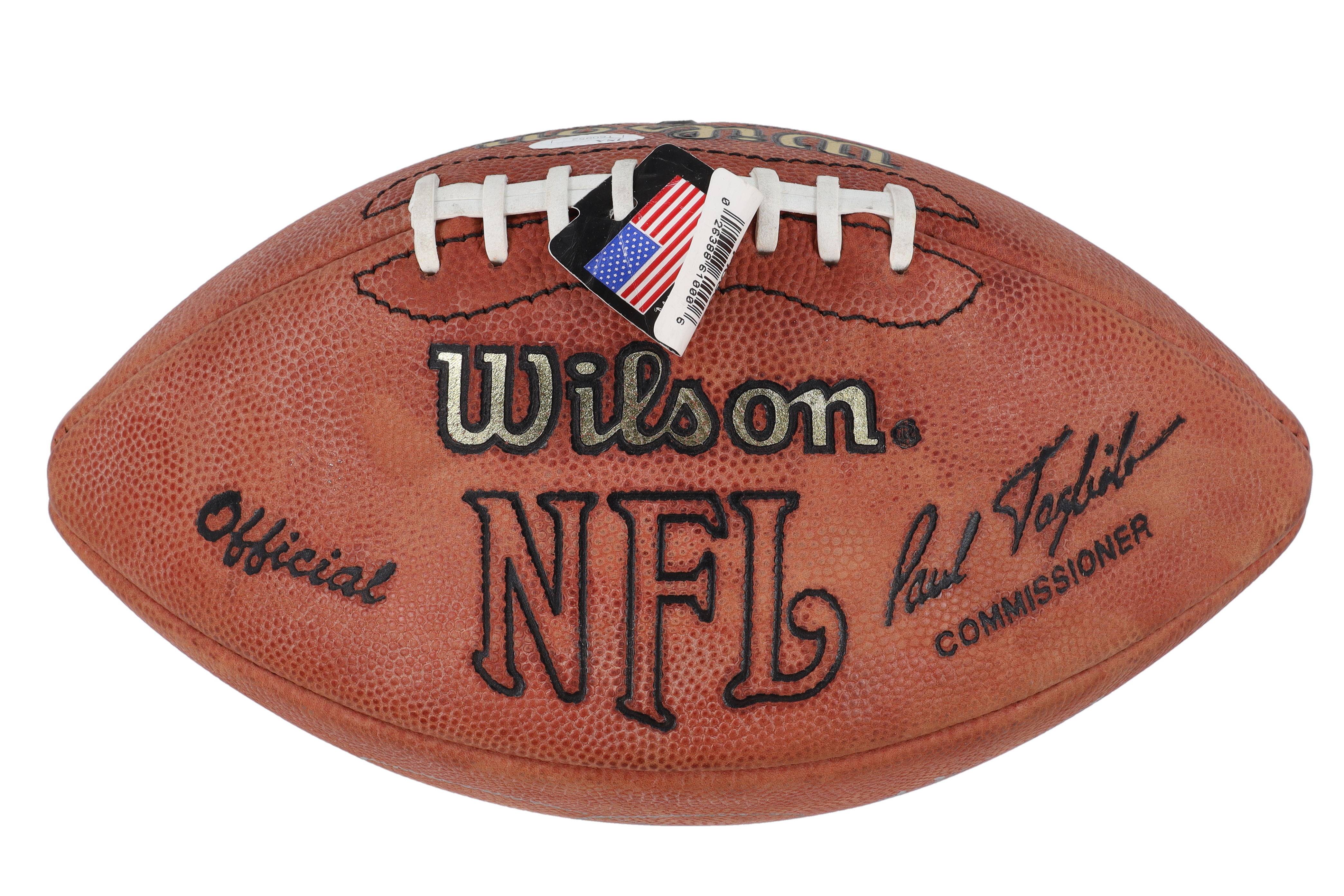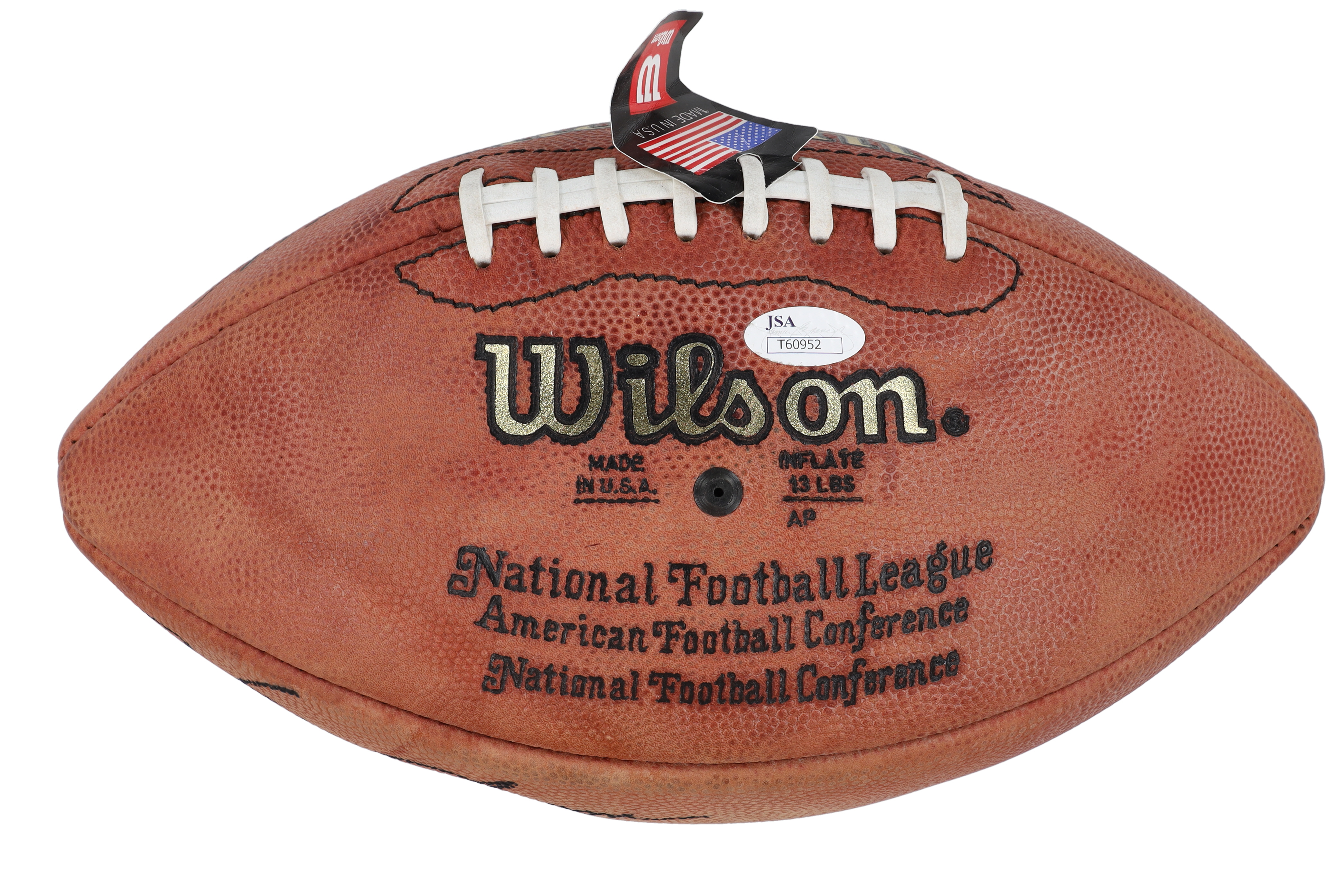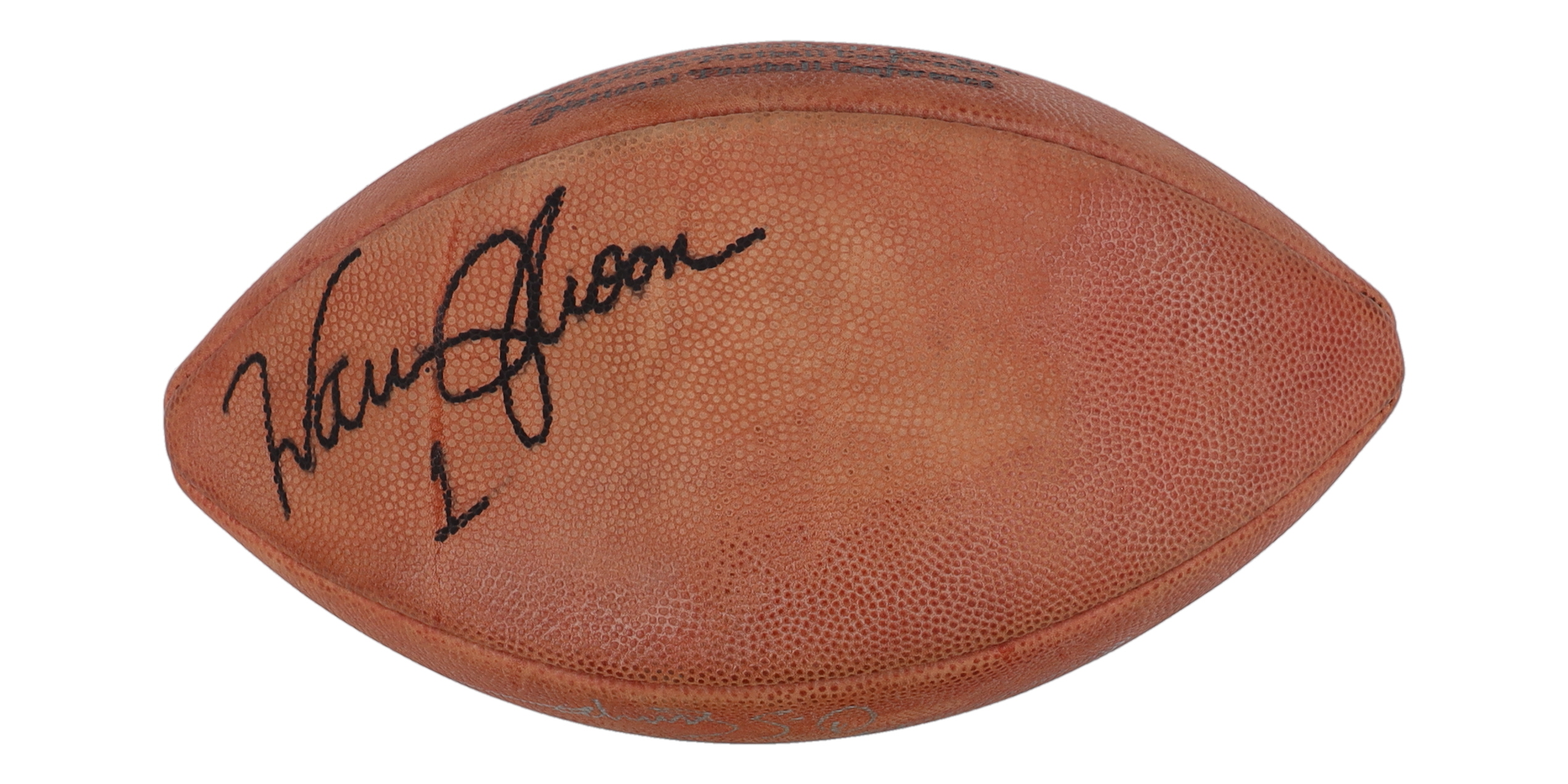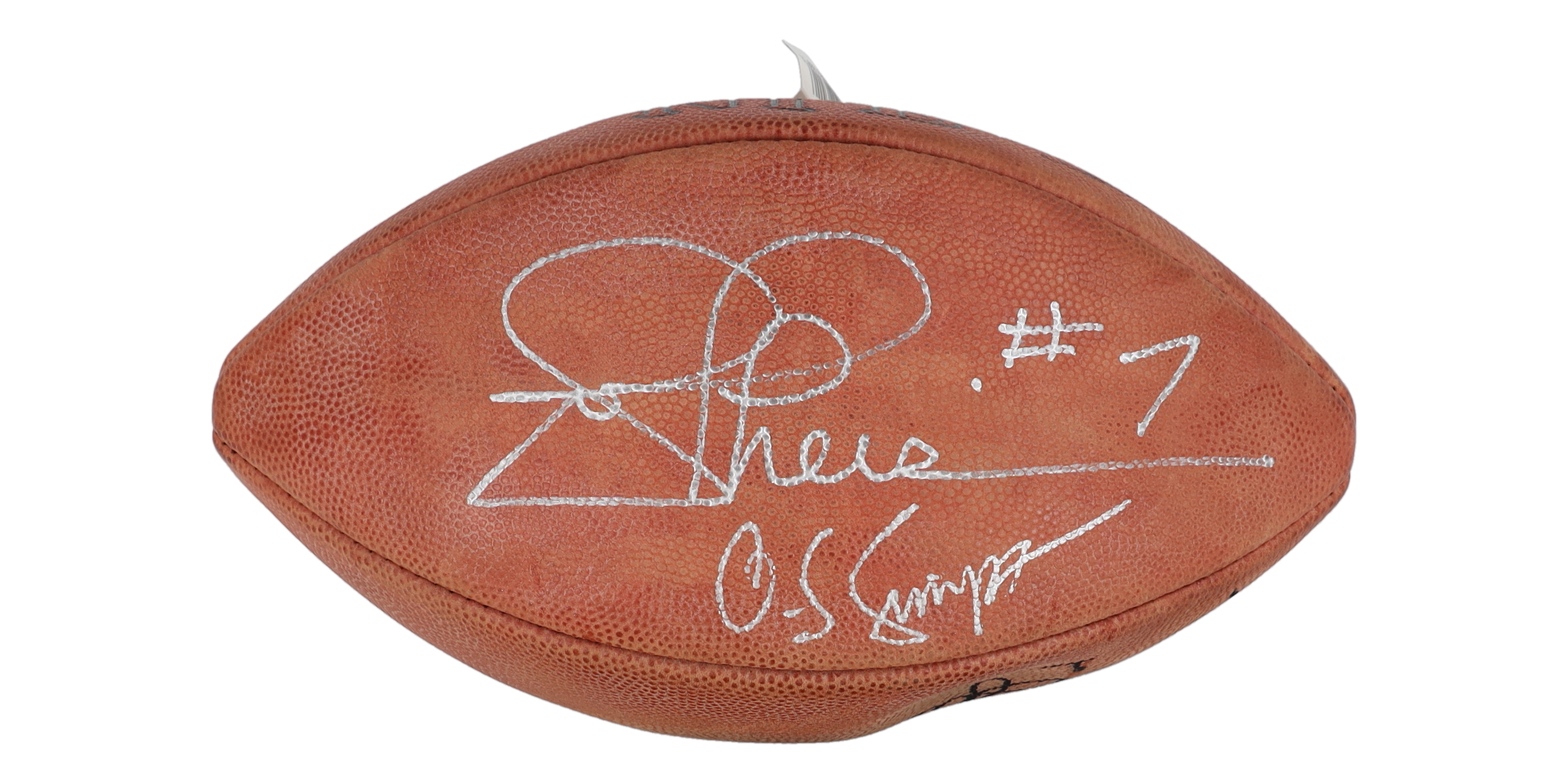 Wilson Super Grip full size NFL football. Hand-signed and inscribed by Warren Moon (Houston Oilers, HOF), Joe Theismann (Washington Redksins) and O. J. Simpson (Buffalo Bills, HOF). Please note, the football does not hold air and shows signs of wear.