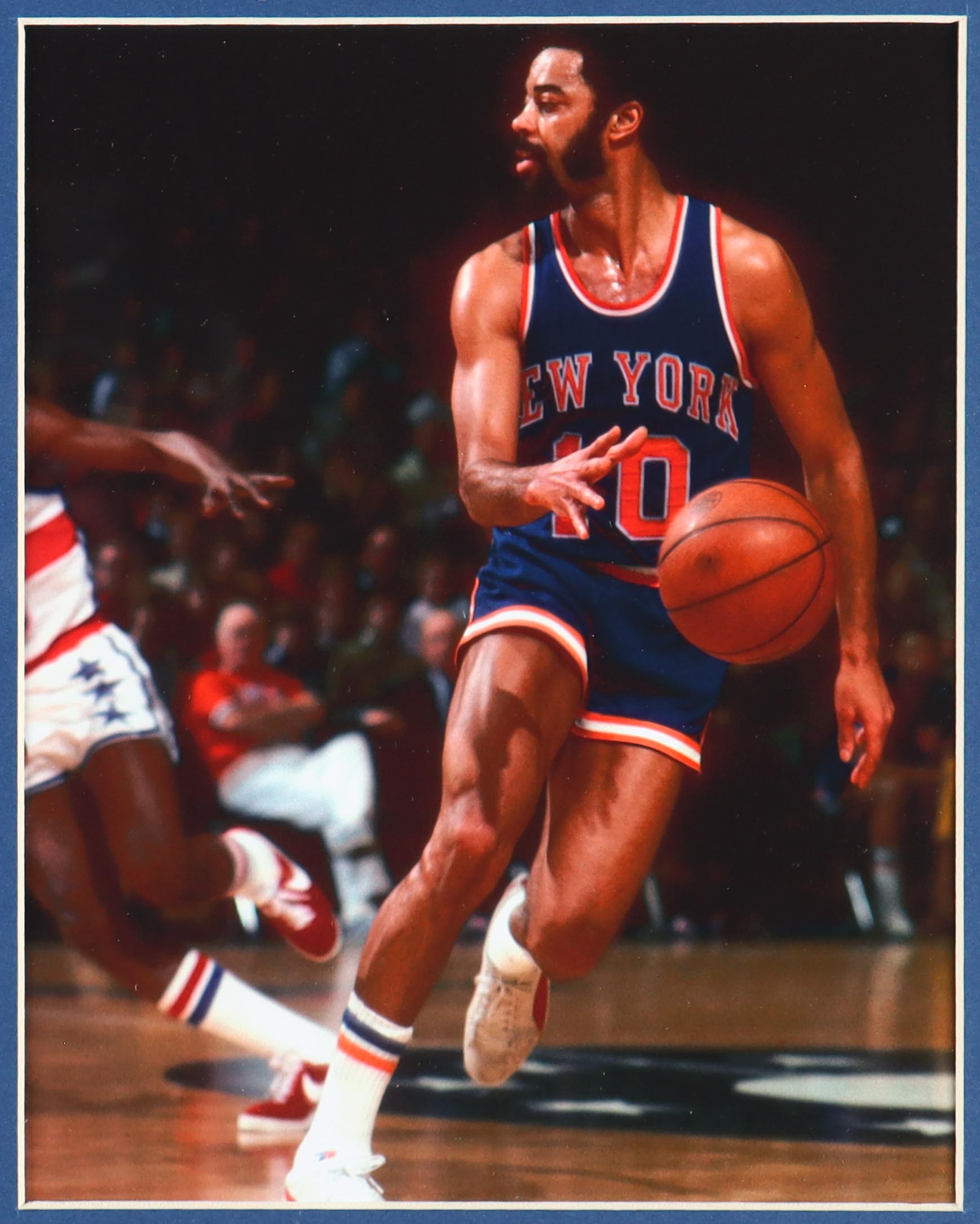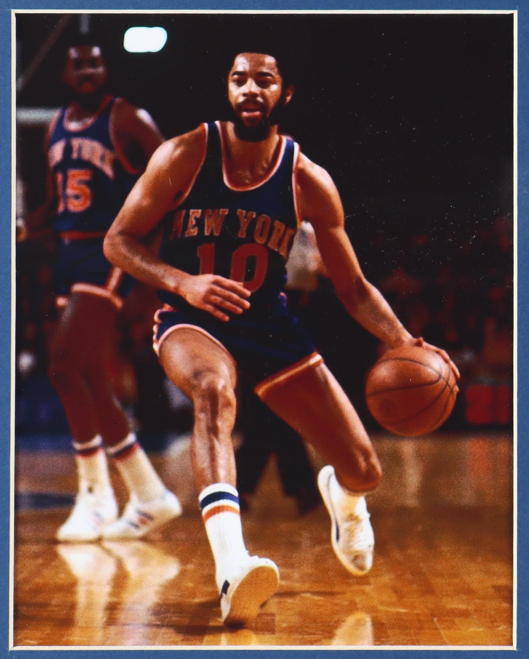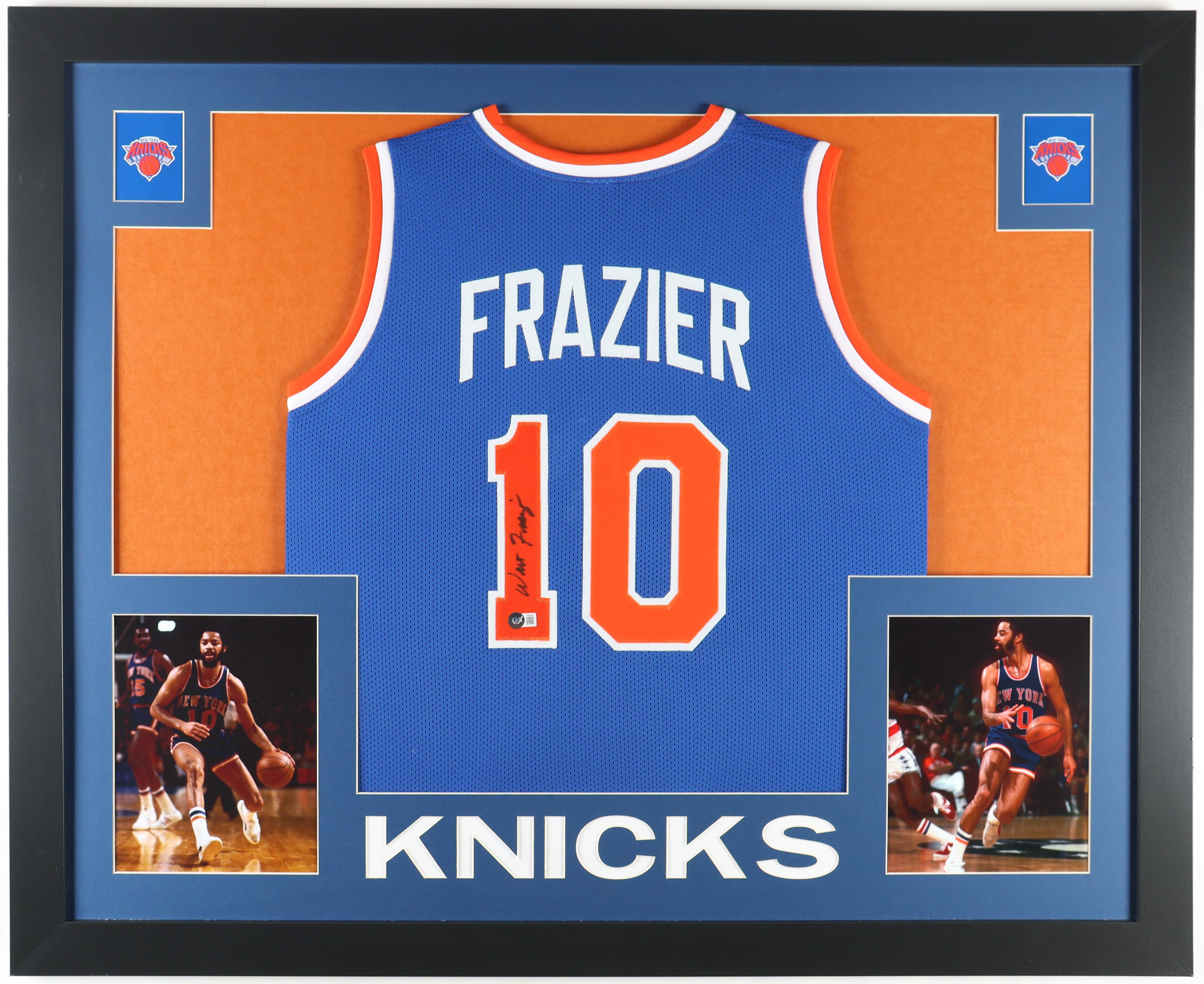 Custom frame measures 35" x 43" in size and features a jersey hand-signed by Walt Frazier.