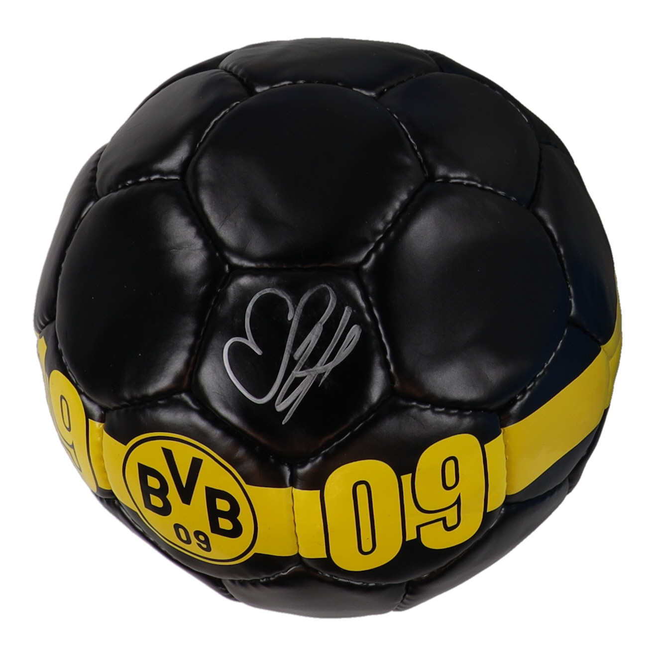 Borussia Dortmund logo soccer ball. Hand-signed by Erling Haaland. Please note, the signature is smudged.
