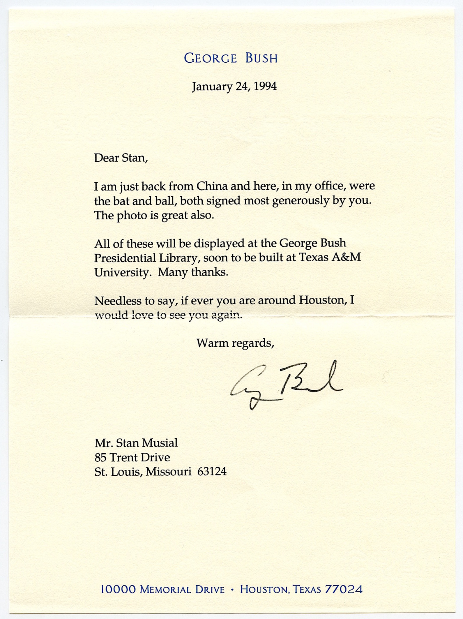 This original letter measures approximately 6.25" x 8.5" in size and is typed on George Bush's personal stationary. The letter is dated January 24, 1994 and is a thank-you letter to Stan Musial.