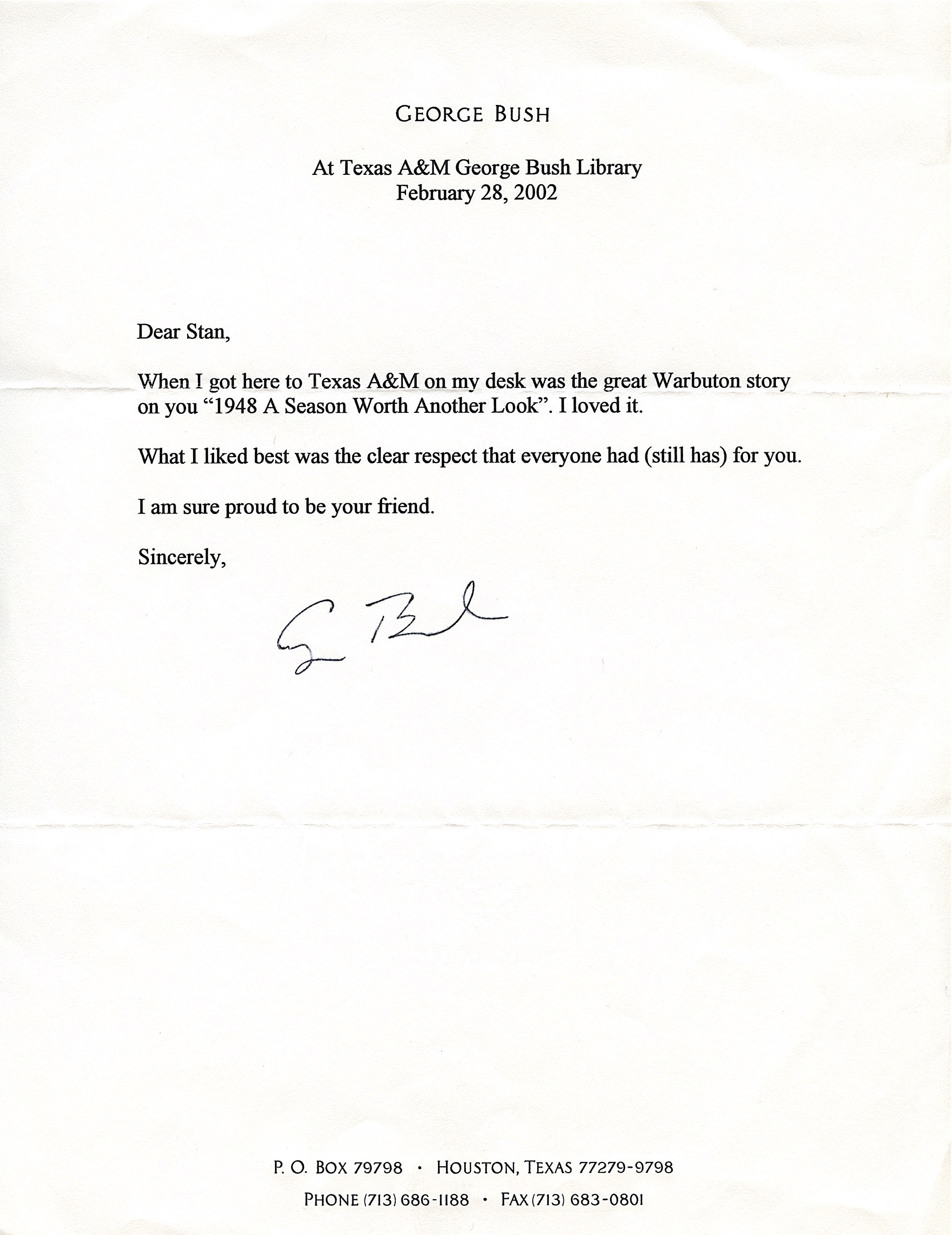 This original letter measures approximately 8.5" x 11" in size and is written on George Bush's personal stationary. The letter is dated February 28, 2002 and is written to Stan Musial.