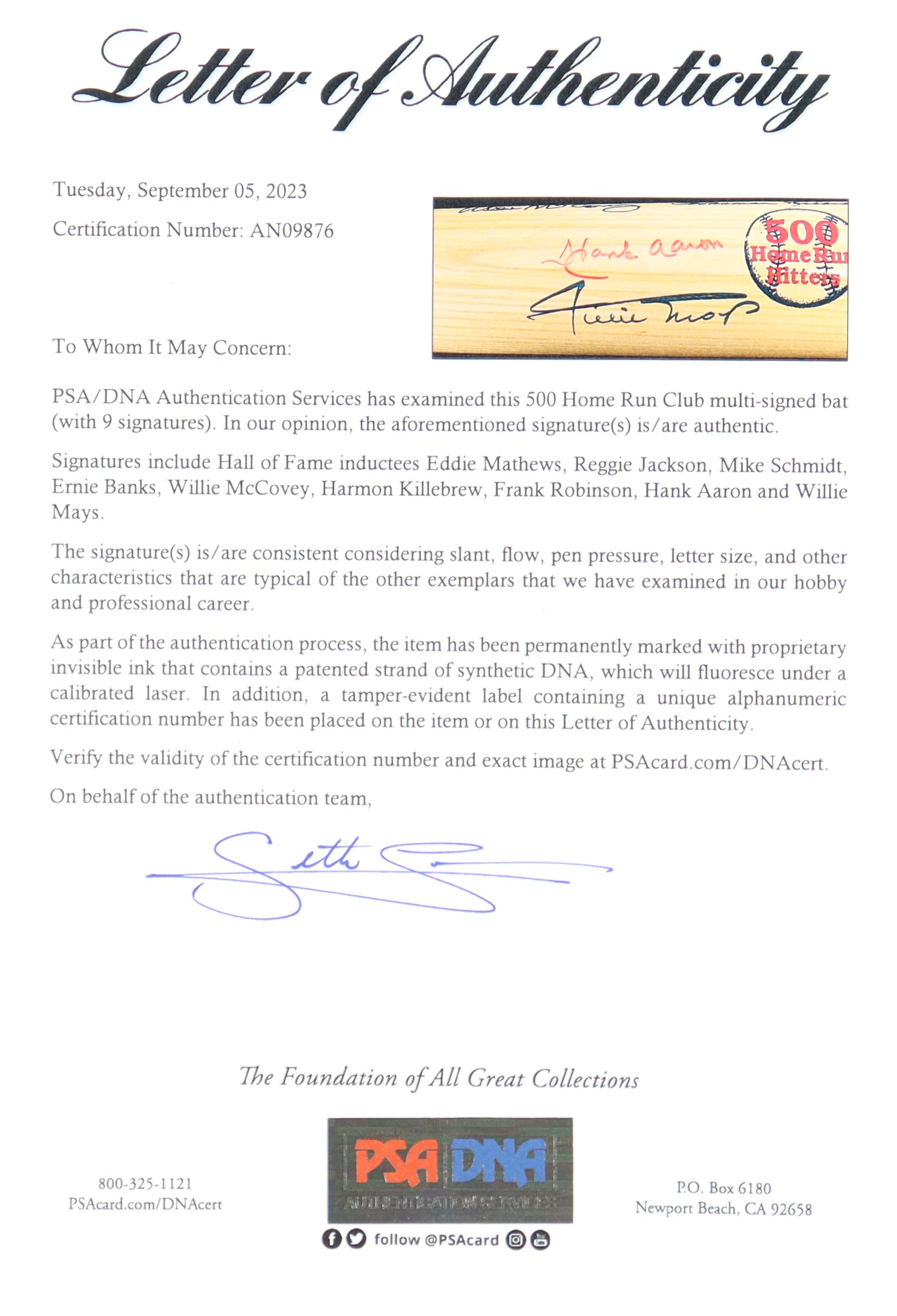 "500 Home Run Club" Cooperstown 500 Run Hitters Baseball Bat Signed By (9) With Hank Aaron, Willie Mays, Frank Robinson, Harmon Killebrew, & Ernie Banks (PSA)