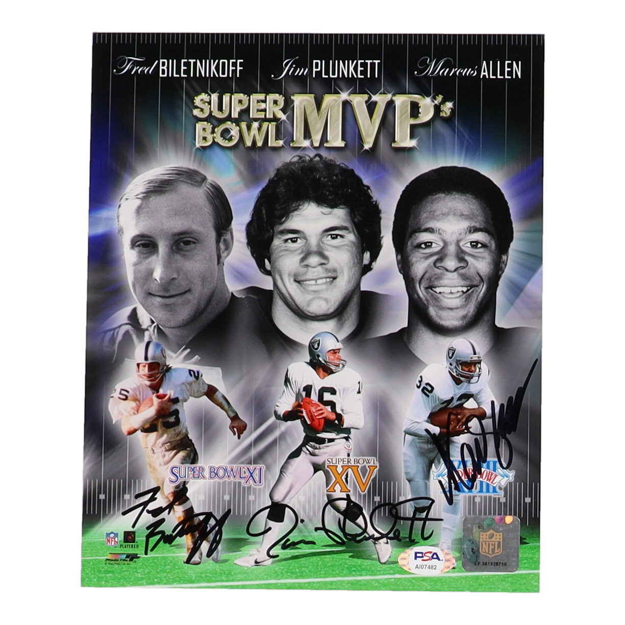 Photo measures 8" x 10" in size has been hand-signed by Fred Biletnikoff (HOF), Jim Plunkett, and Marcus Allen (Los Angeles Raiders, HOF)